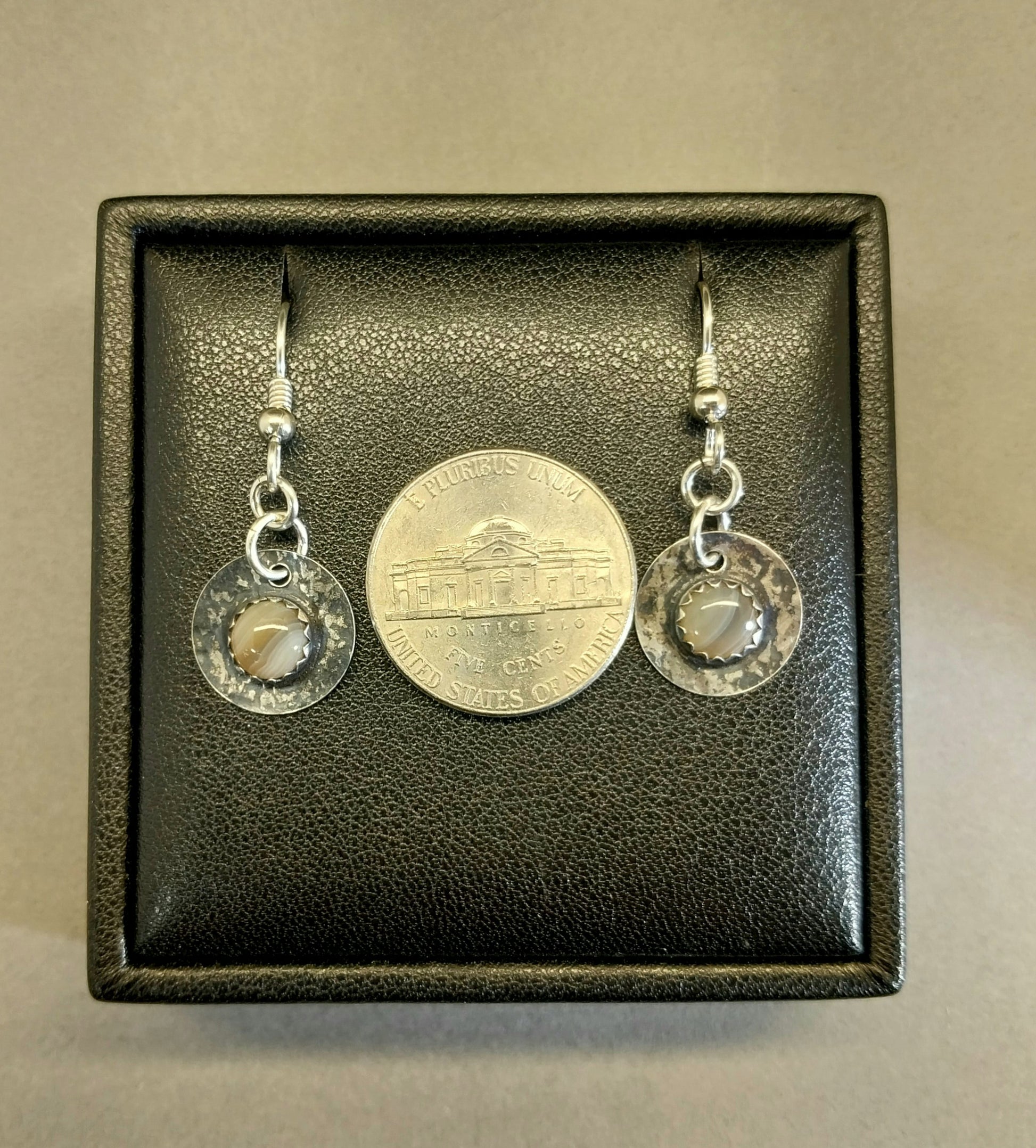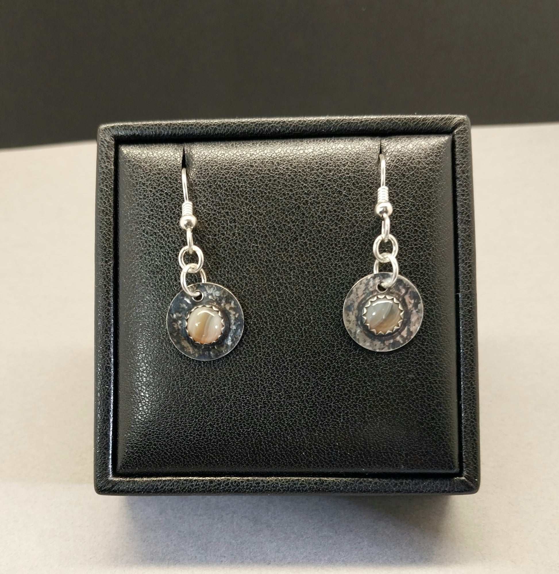 These Lake Superior agate earrings are made with beautiful light brown banded agates. These were cut from pebble size stones and match each other very well. The stones are tiny domed rounds at about 6 mm across. I patterned and antiqued (intentional darkening of the silver) this set to a deep gunmetal color. The discs measure about 13 mm wide so these are a fairly small pair of earrings. This is a unique handmade set of Lake Superior agate earrings in all solid silver.The settings are lacquered to protect their finish. The ear wires are argentium sterling silver which is resistant to tarnish and easy to clean.