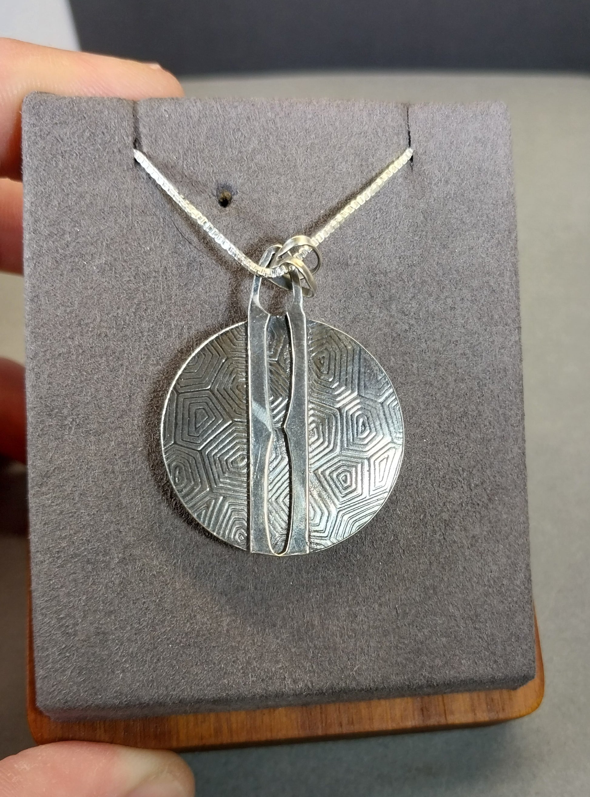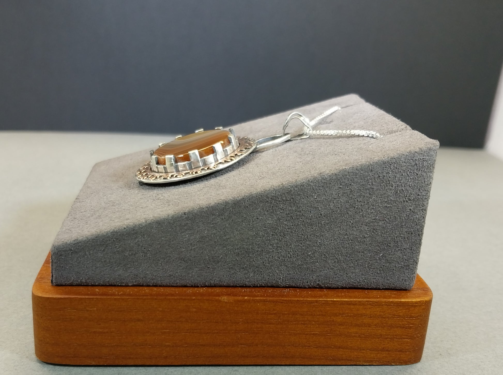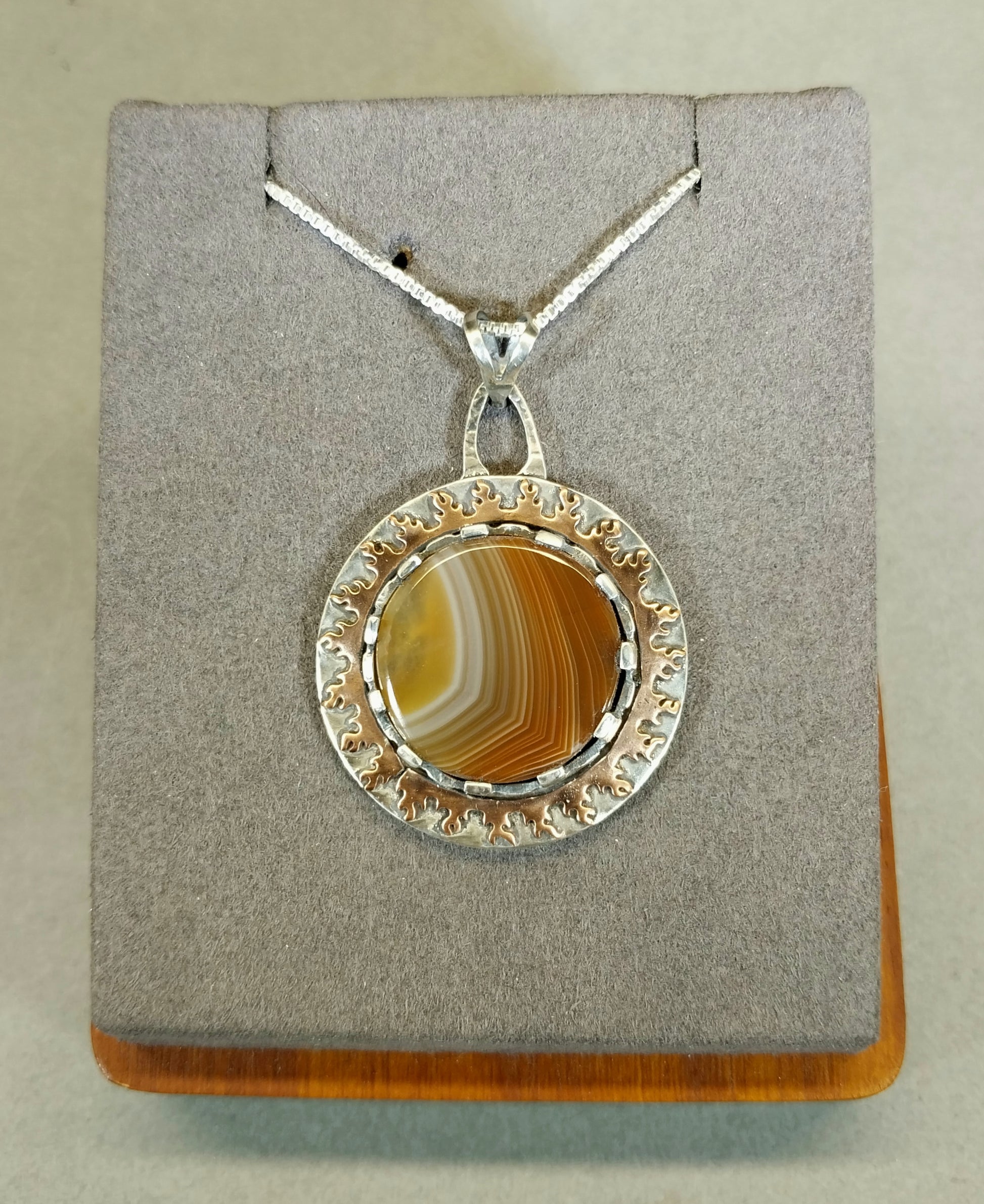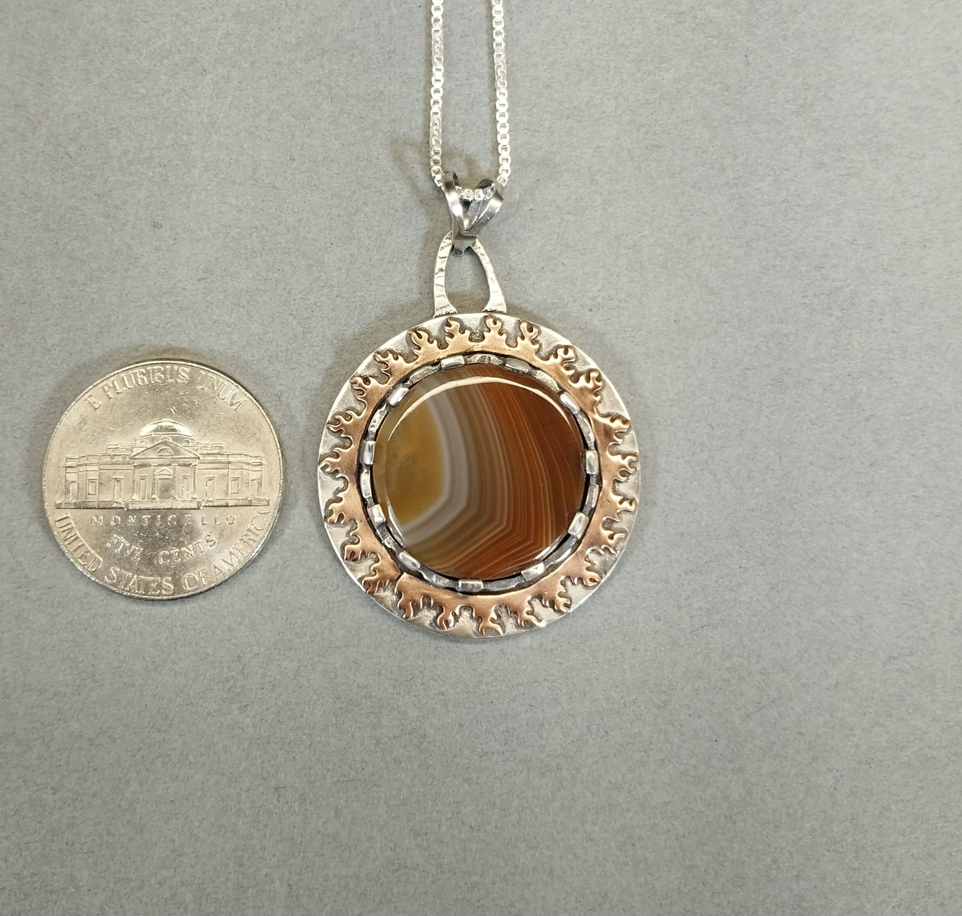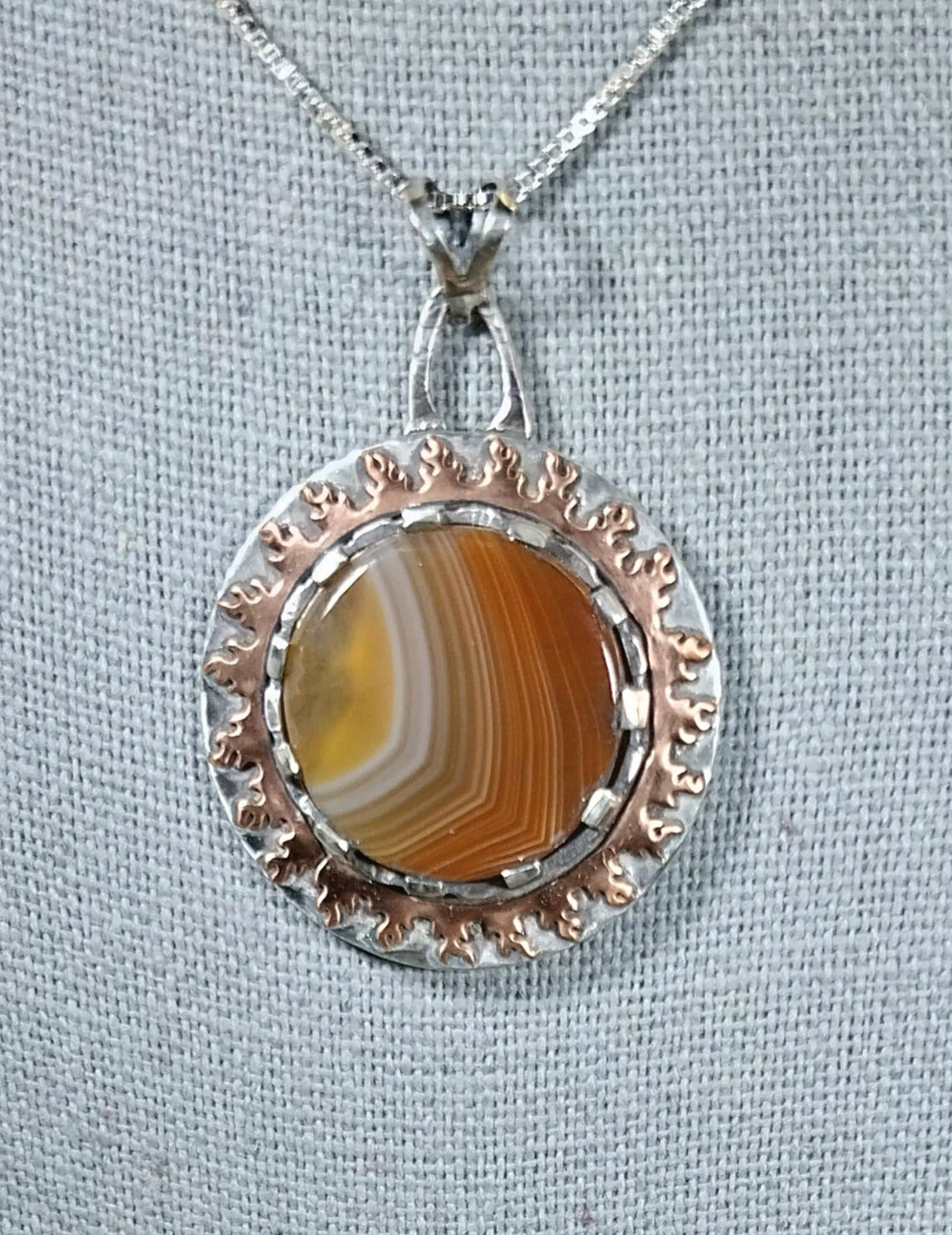 Here's a statement piece in silver and copper featuring a round flat cut Lake Superior Agate. This is an agate we found in Northern Wisconsin. It's an orange and white banded stone with nice color transition that I positioned from left to right in the setting I built for it. The setting is 925 sterling silver with a copper flame ringing the outside edge. I added a nice pattern to the back of this piece and antiqued it (intentionally darkened) to help bring out the depth in the pattern. I made the back with hand forged/formed recycled sterling silver. This is a larger piece but wears comfortably. The chain is 20 inches in length and is solid sterling silver. The pendant measures about 1.46 x 1.42 in inches or is about 28 mm across. The agate is about 19 mm across. This is a piece that will get noticed!