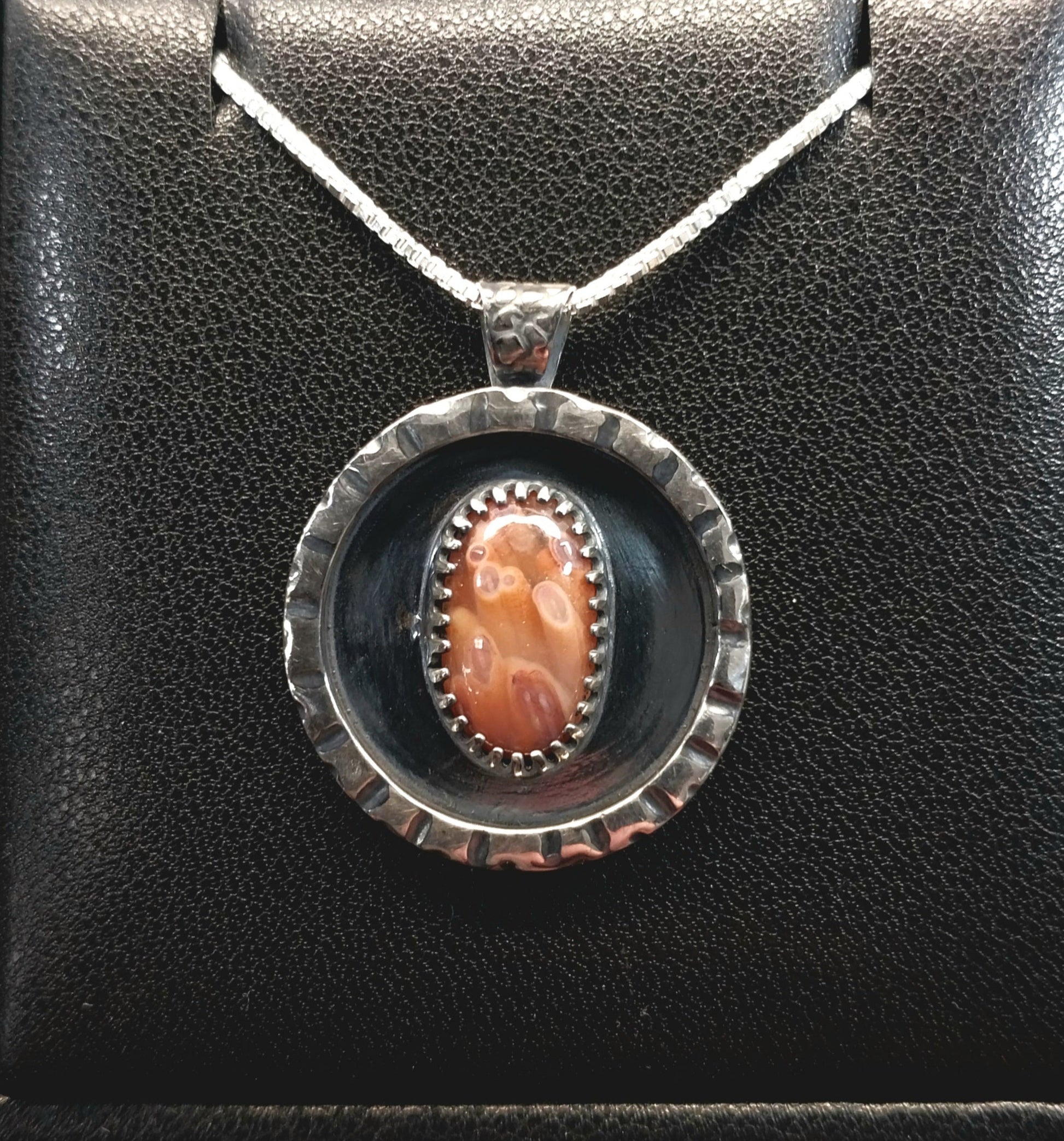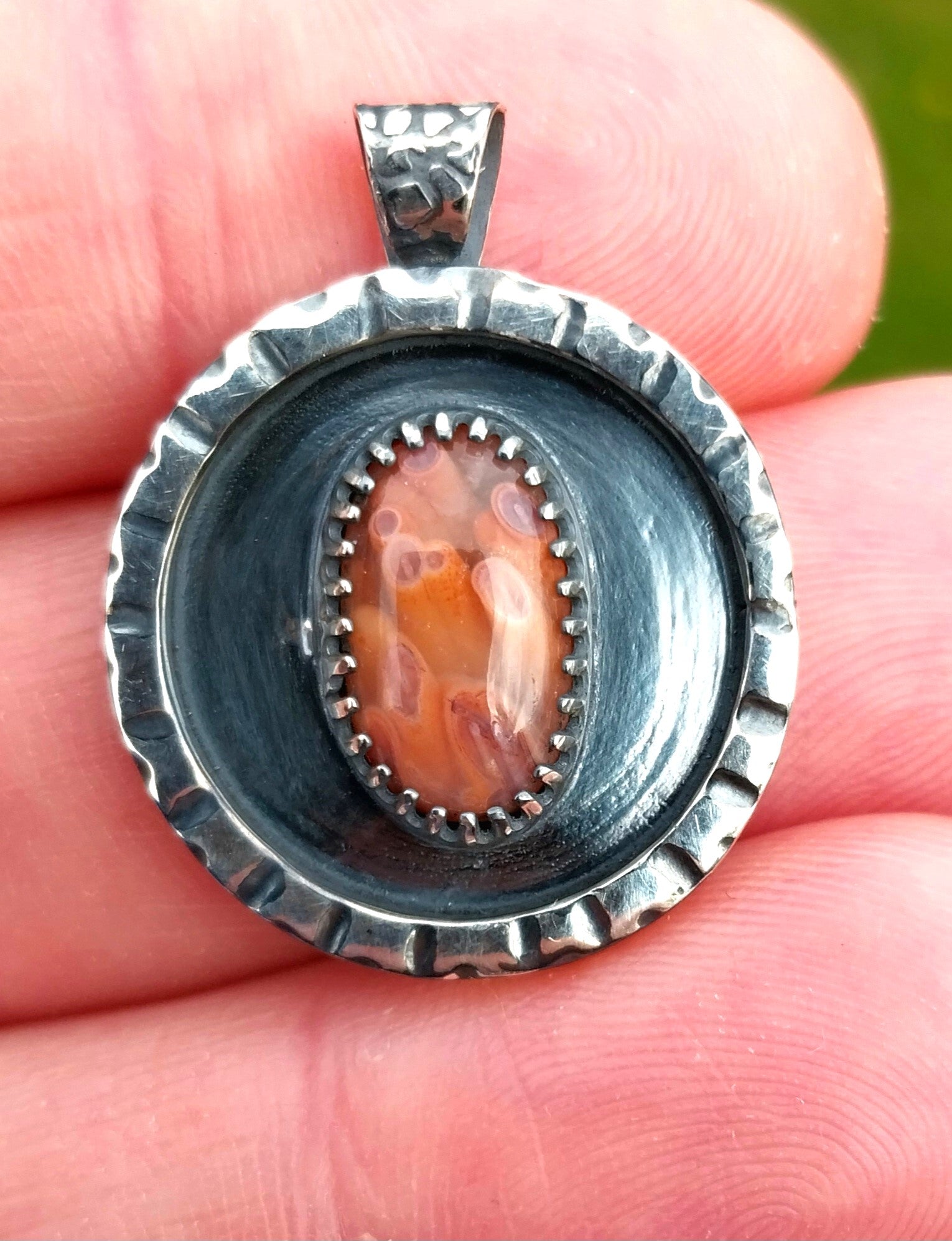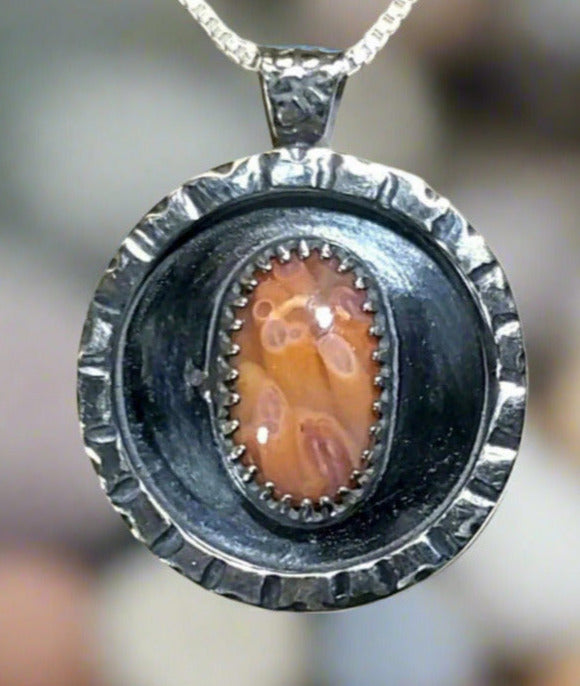This is a rare Wisconsin found Lake Superior tube agate that I found in north central Wisconsin. This stone is small but has incredible detail and depth with tubes that remind me of flowers or ocean plant life. It's really a unique stone both for it's features and colors. It has a 3D appearance with color that ranges from orange to pink. I crafted a setting as unique as the agate it holds using primarily my own hand forged and formed recycled sterling silver. The agate is in a shadow style frame. The details on the top front edge are all hand cut. I textured the bail with a pebble design and the back in a northern forest design which is fitting for this piece because I found the agate in the forest. I antiqued the silver (intentionally darkened it) before polishing it to really bring out the recessed areas in the textures I added to this piece. The stone measures about 14.5 x 9 in mm. Overall including the bail the pendant measures about 29 x 23 mm. The included chain is also solid silver and is 20 inches in length. Thank you for looking!