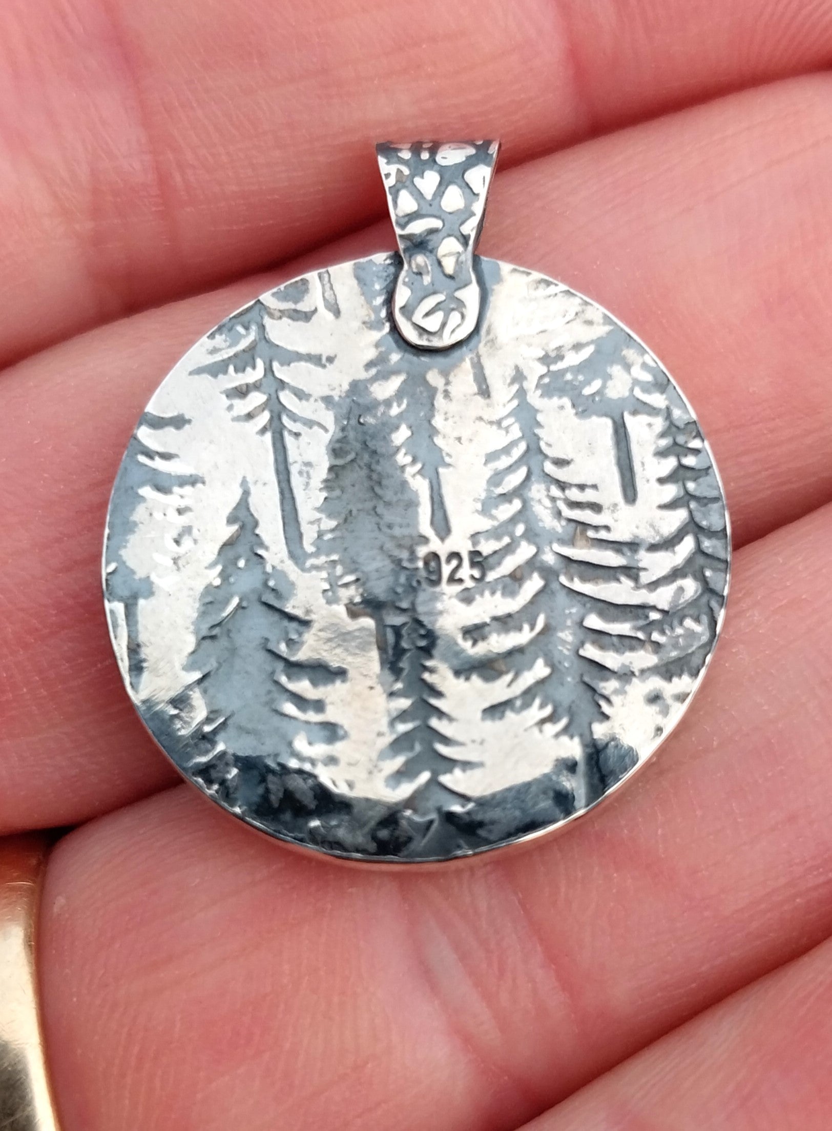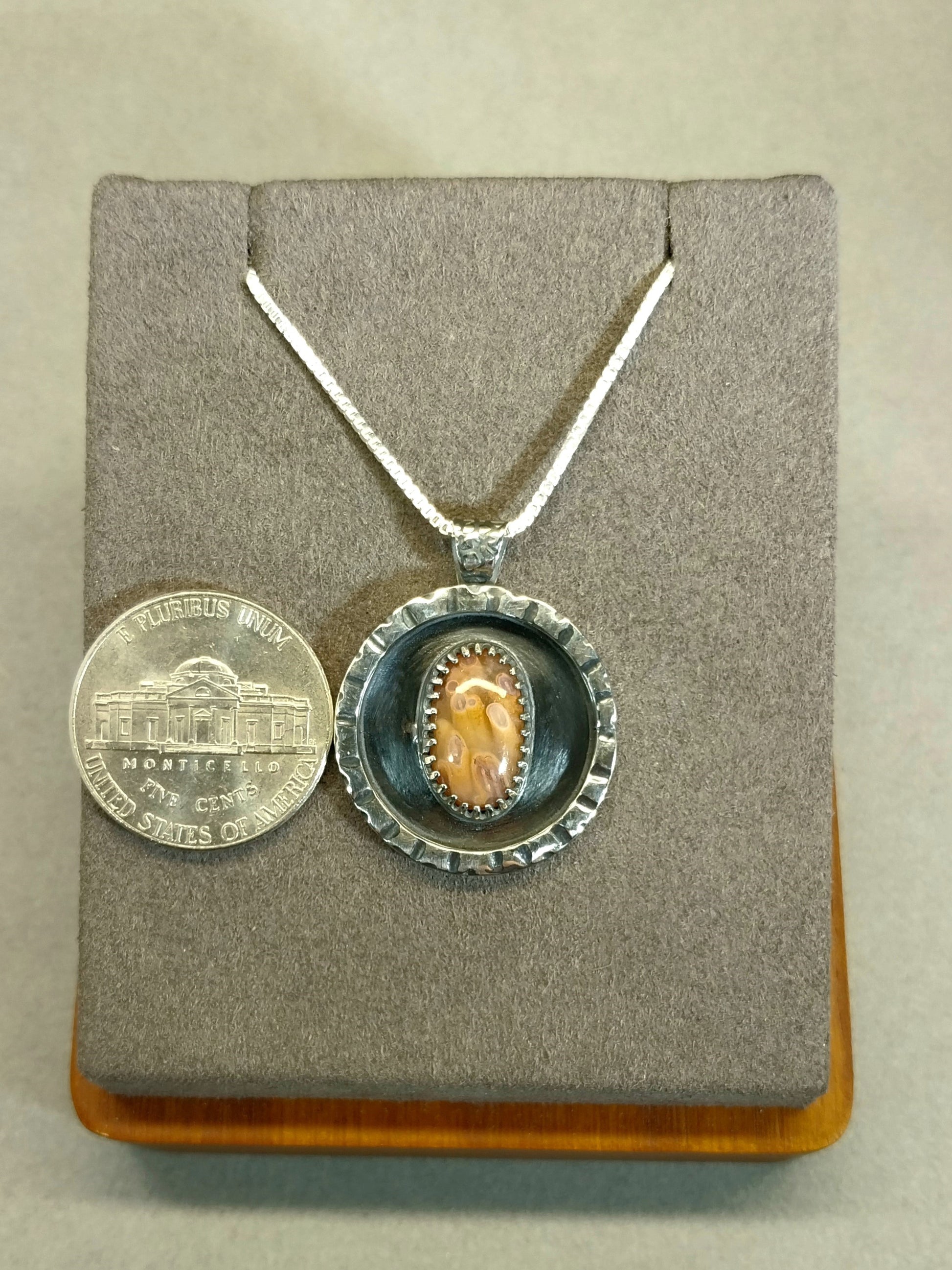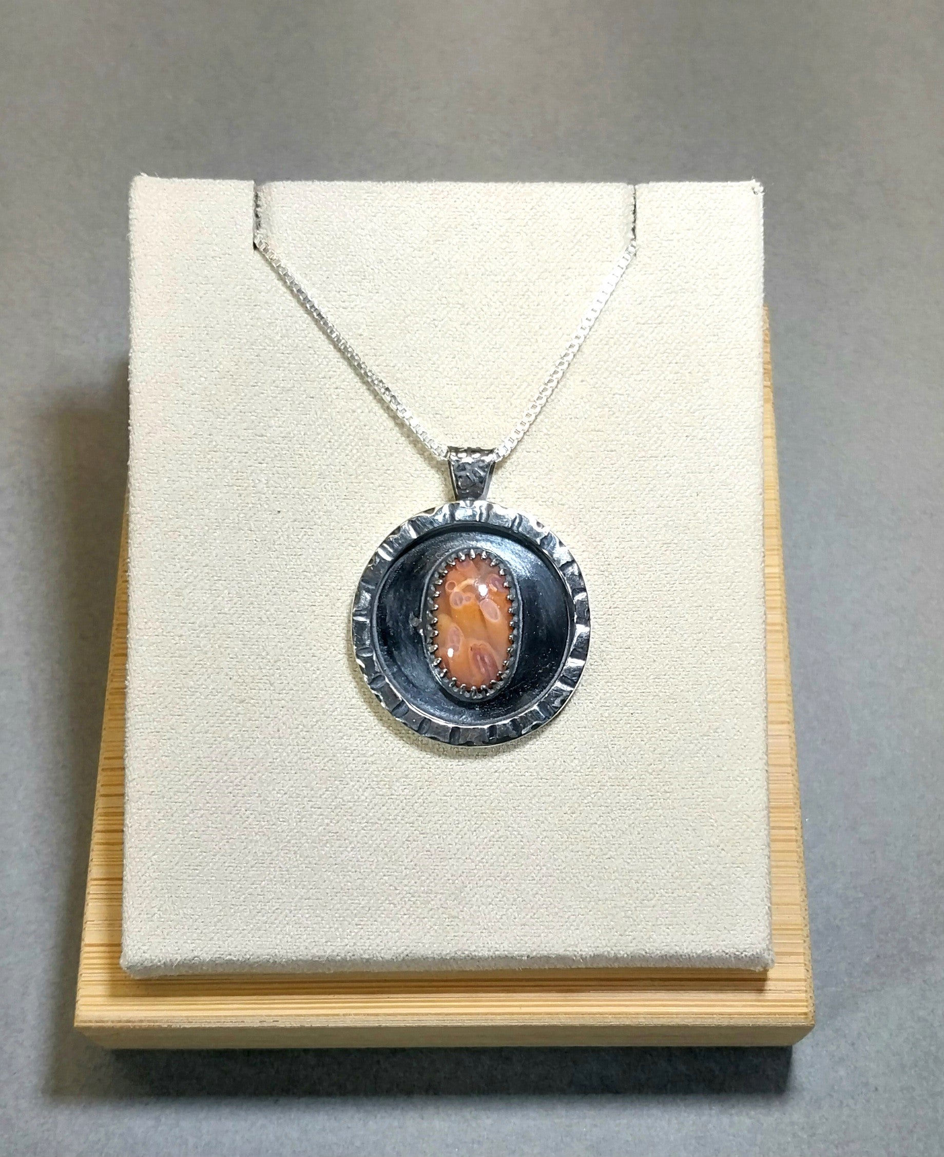 This is a rare Wisconsin found Lake Superior tube agate that I found in north central Wisconsin. This stone is small but has incredible detail and depth with tubes that remind me of flowers or ocean plant life. It's really a unique stone both for it's features and colors. It has a 3D appearance with color that ranges from orange to pink. I crafted a setting as unique as the agate it holds using primarily my own hand forged and formed recycled sterling silver. The agate is in a shadow style frame. The details on the top front edge are all hand cut. I textured the bail with a pebble design and the back in a northern forest design which is fitting for this piece because I found the agate in the forest. I antiqued the silver (intentionally darkened it) before polishing it to really bring out the recessed areas in the textures I added to this piece. The stone measures about 14.5 x 9 in mm. Overall including the bail the pendant measures about 29 x 23 mm. The included chain is also solid silver and is 20 inches in length. Thank you for looking!