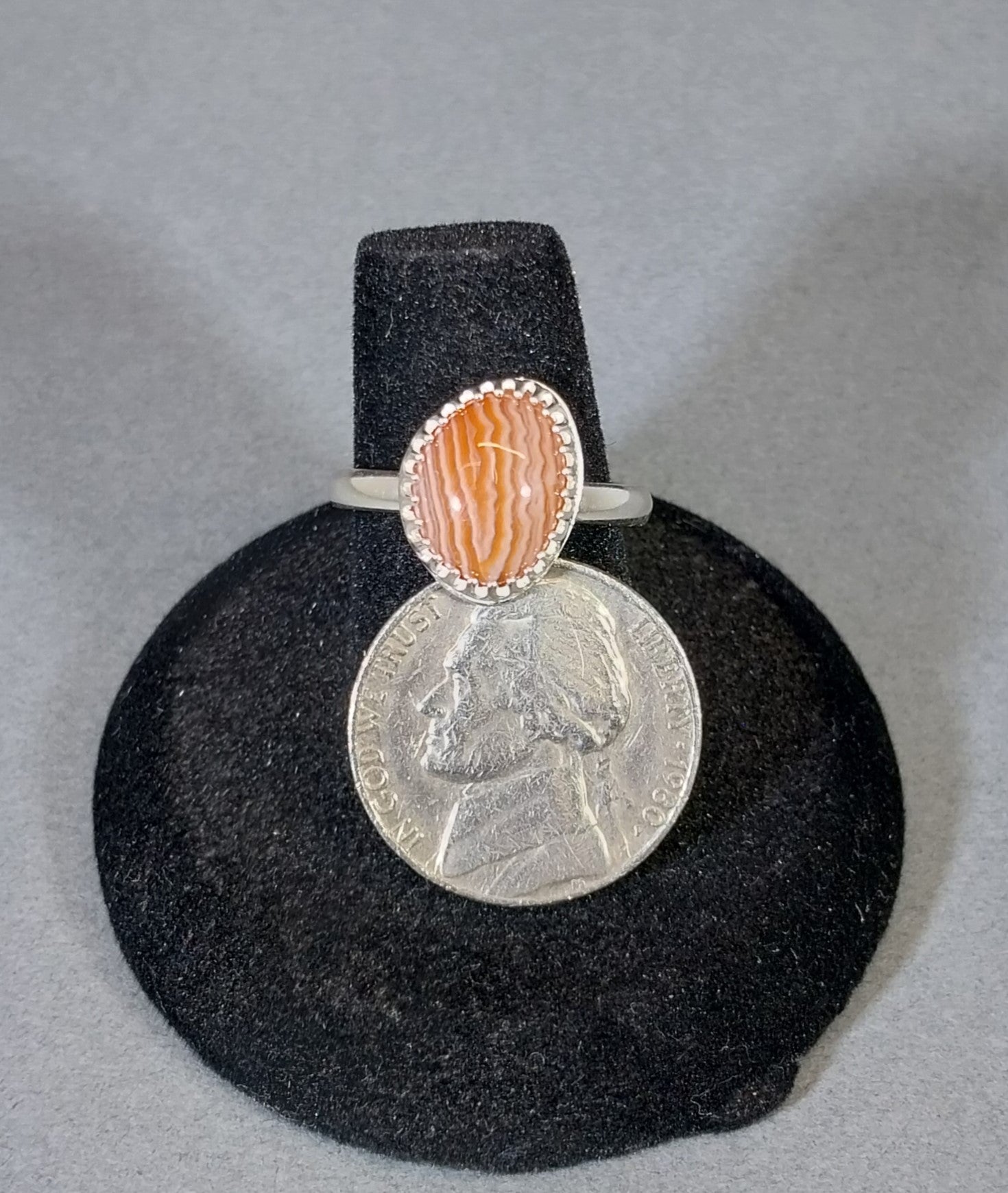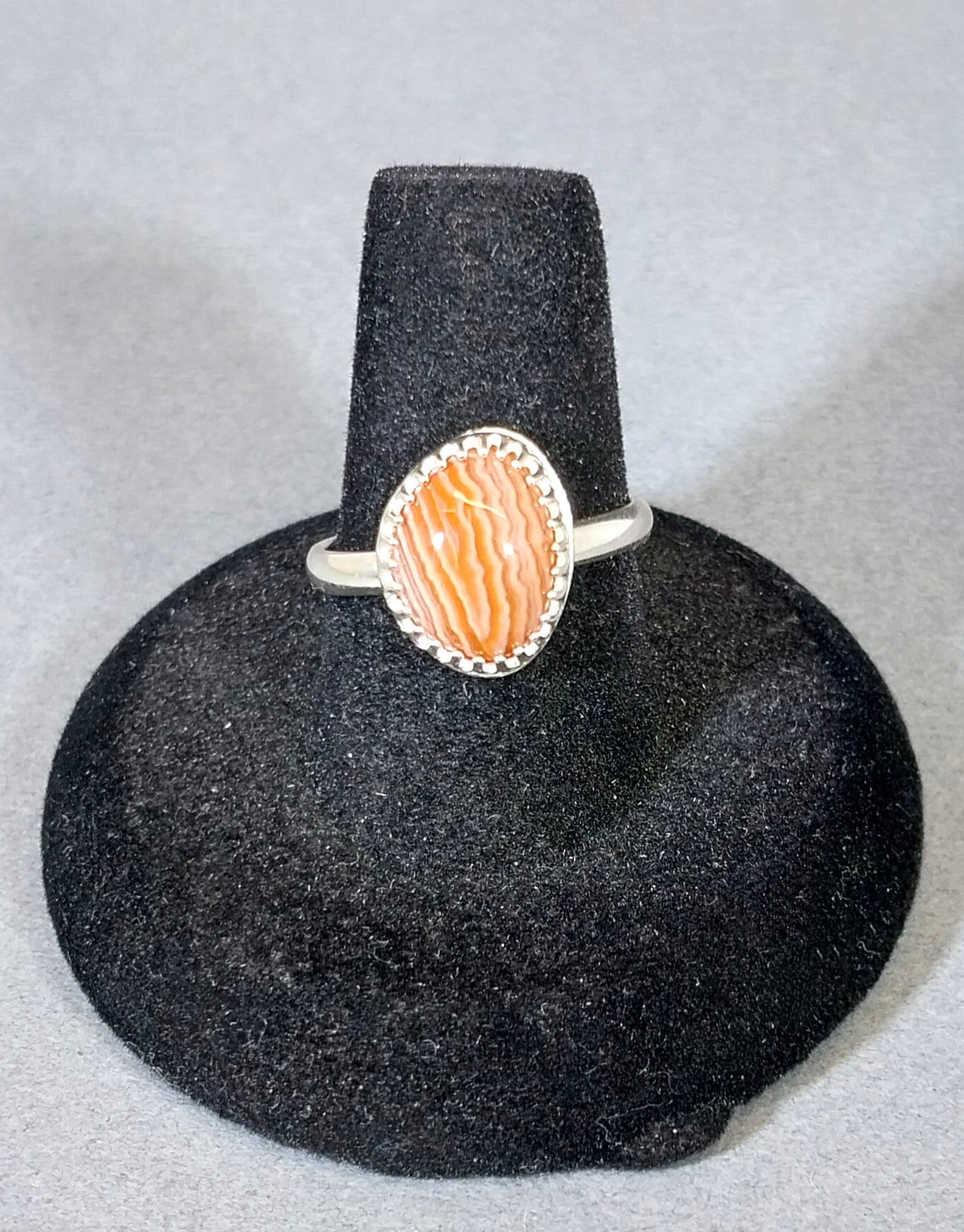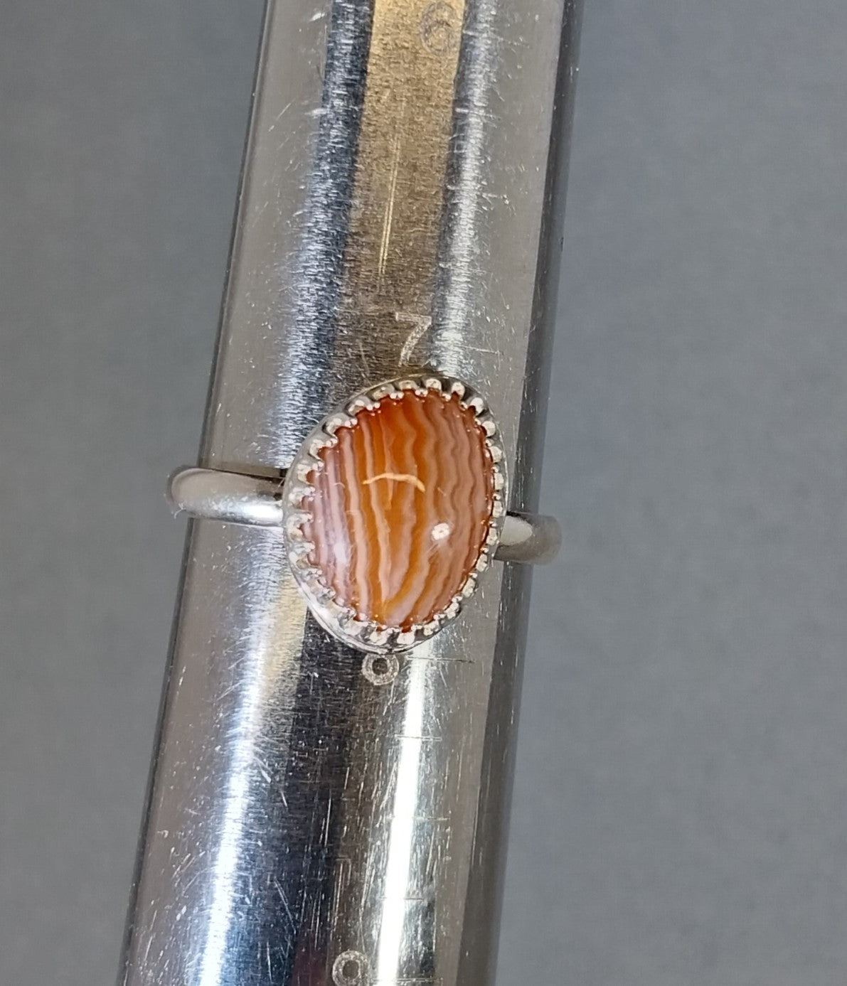 I cut this beautiful Lake Superior Agate from a MN found stone and set it in solid silver. The stone has amazing fortification banding in white over a base color of medium orange. This ring is a set size 7 1/2. The agate measures about 13 x10 mm. This artisan handcrafted ring would make a great gift.