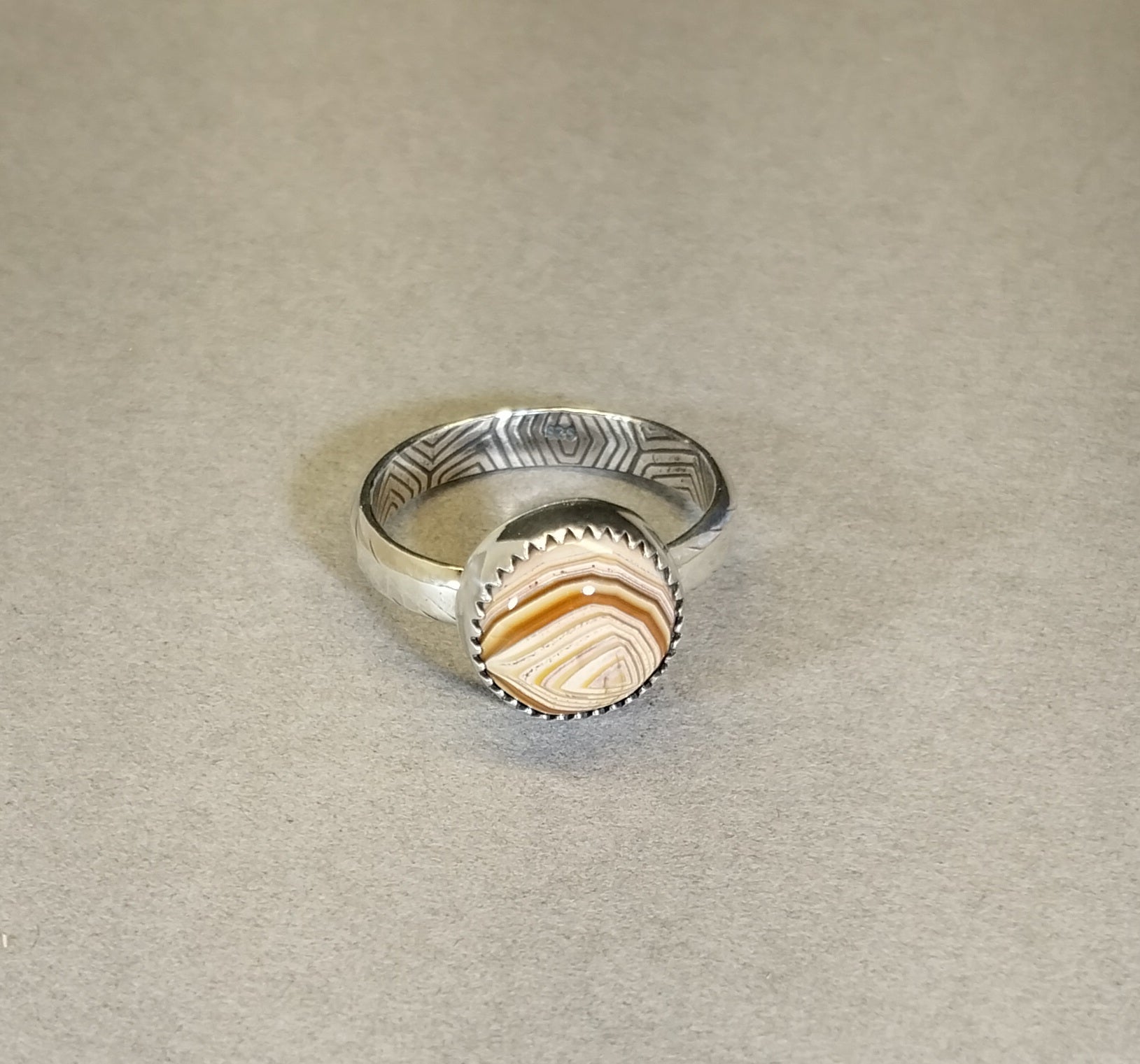 This is a beautiful Lake Superior agate ring in solid sterling silver. I cut the agate from one Sarah found in Herbster Wisconsin this past summer. It's a rare paint agate in brown and white. The majority of the paints we find are orange so it's really very different to find one that's brown and cream colored. The agate has great banding and a nice fortification pattern. The bottom of the setting is made with my hand forged and formed recycled sterling silver sheet. This piece is big on textures but they are subtle so they don't overpower the piece as a whole. I added abstract and hand carved textures to the inside of the band and a hand hammered exterior that glints a bit when moved in the light. The underside of the setting is also textured in a pebble like design. I antiqued the silver (intentionally darkened) to bring out the details in the setting. I chose a fine silver bezel in a serrated edge design to hold the stone. I really like this stone. It's different and unique but still very recognizable as an agate from a distance. This ring is a set size 8. The setting for this ring measures about 11 mm across. The band is about 3.3 mm wide. Lakers are natural stones that are best viewed in direct sunlight. I like to tell people if it's dark when they receive their piece to use their phone flashlight to view the stone.
