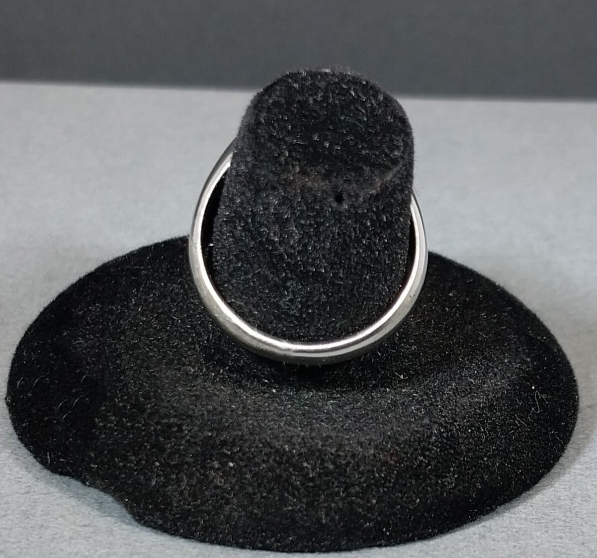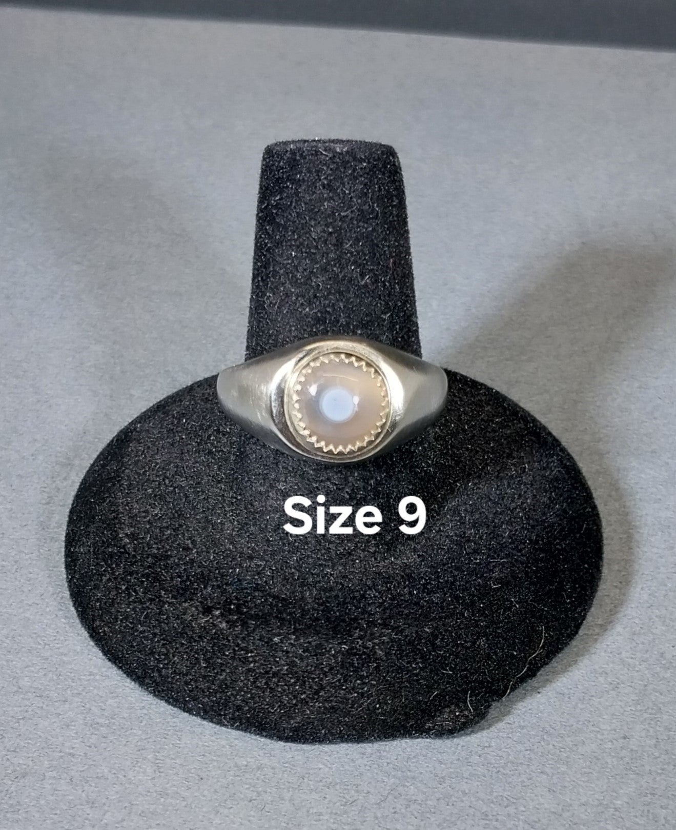 Size 9: This is a Wisconsin found LSA eye agate that I found on a trail. It has th elook of ghostly transparency with a bright white eye just slightly off of center in the domed round stone. The bezel features a serrated edge. The stone is about 9 mm across.