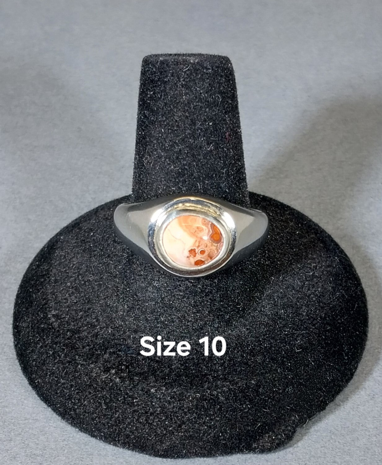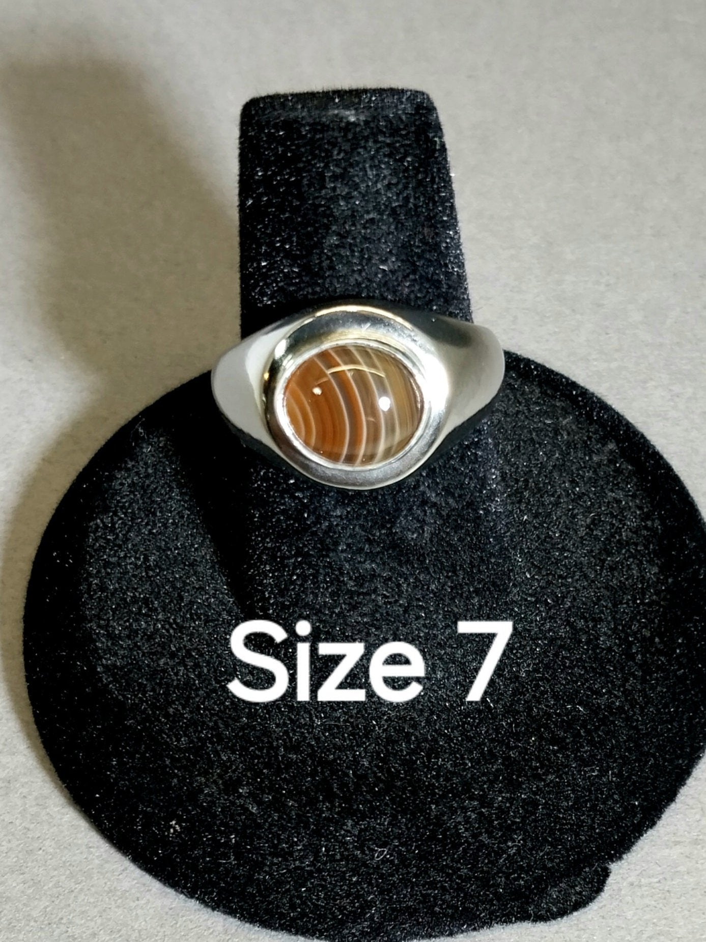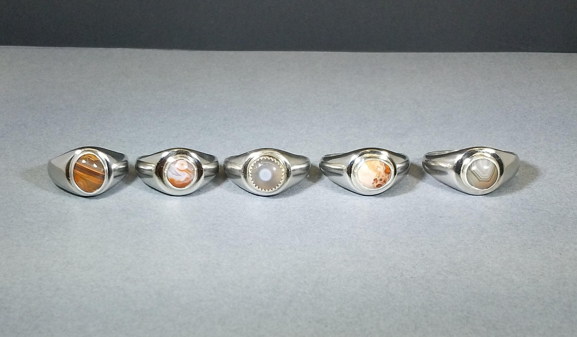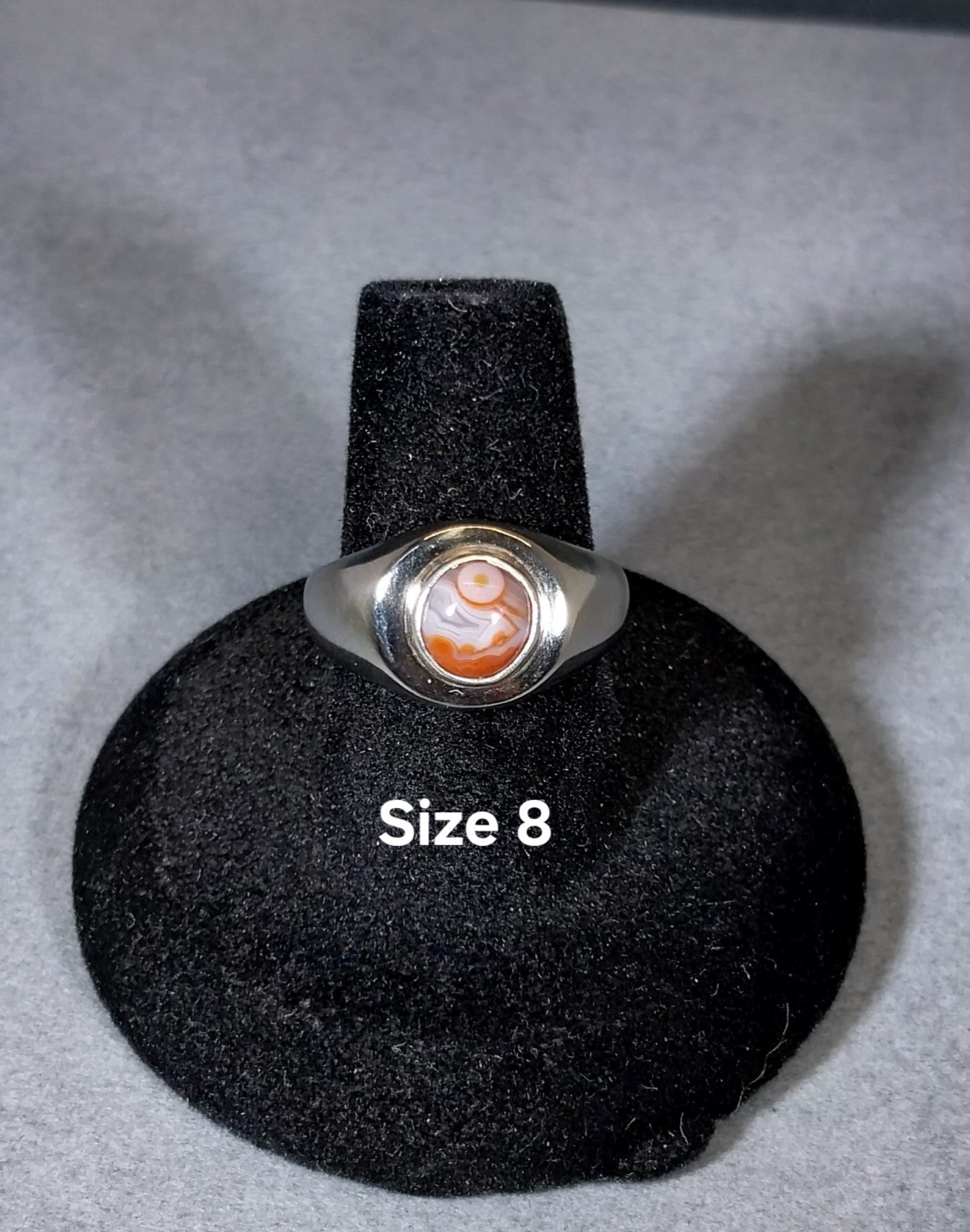 I made these Lake Superior Agate rings with stones we found on our rock hounding adventures that often take us from the eastern UP of Michigan to the North Shore of Minnesota. I came up with this design to have a ring for myself that's eye catching while also being ultra durable. The bands are stainless steel. I cut the agates and craft fine silver bezels for them that I then solder to the bands. These rings look great on anyone! See the pictures for the sizes. You'll get the ring pictured for the size you order. These are whole sizes from 7 up to 11. See below for specifics on each ring.