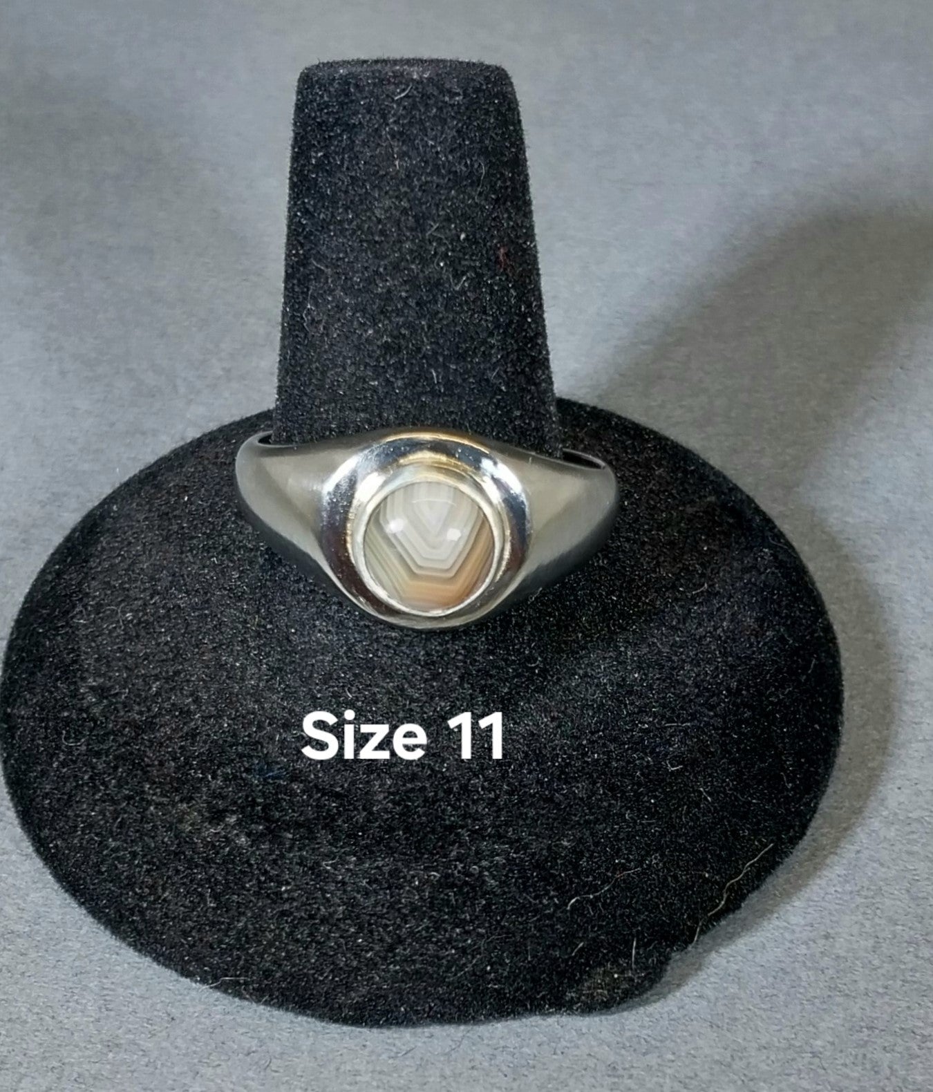 Size 11: This is a Minnesota agate from a north shore beach that features exceptional banding in a fortification pattern. It's light colored in mostly gray with maybe a bit of orange/brown. I've noticed it looks different to me in different lighting. The stone is about 8.6 mm across.