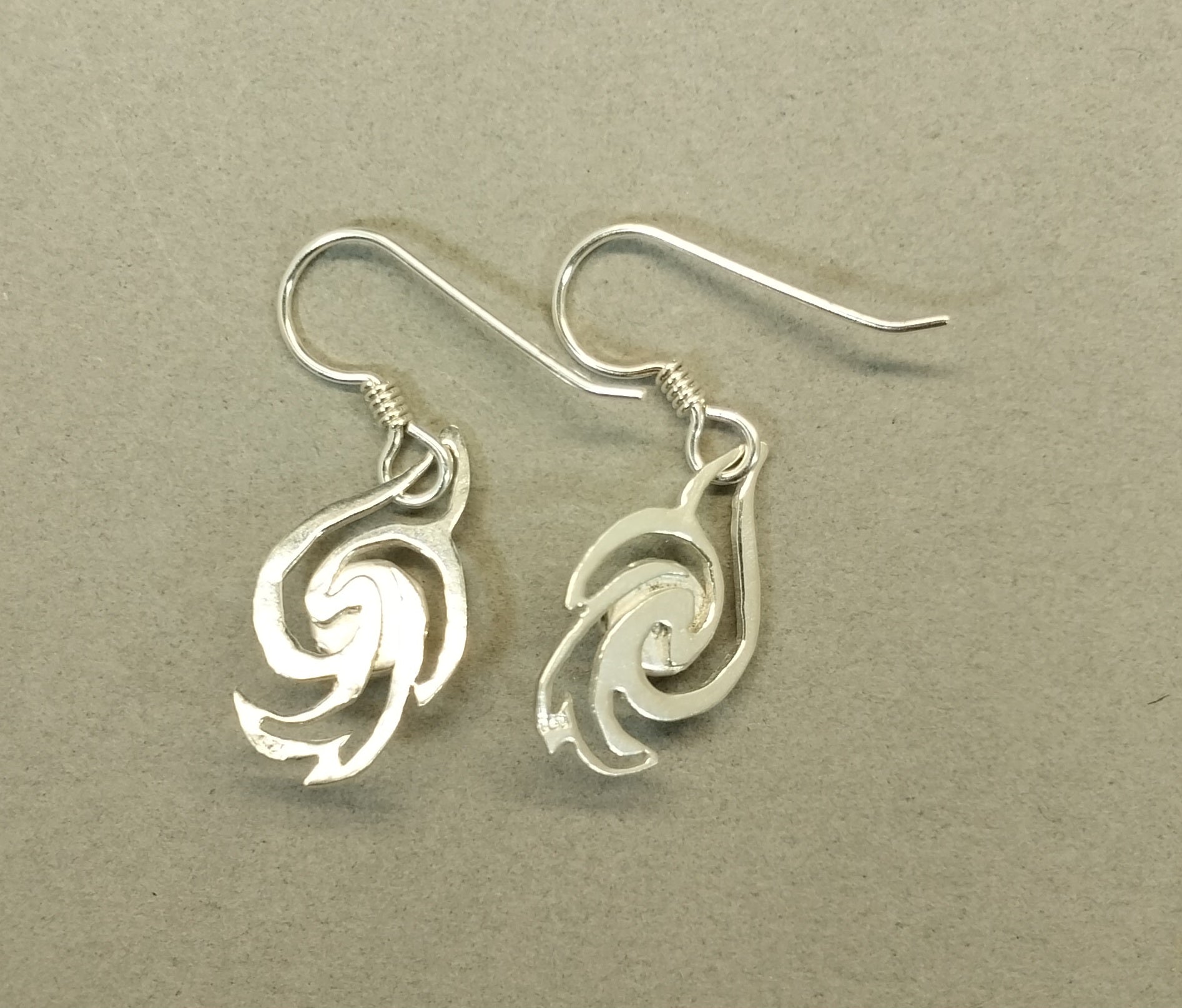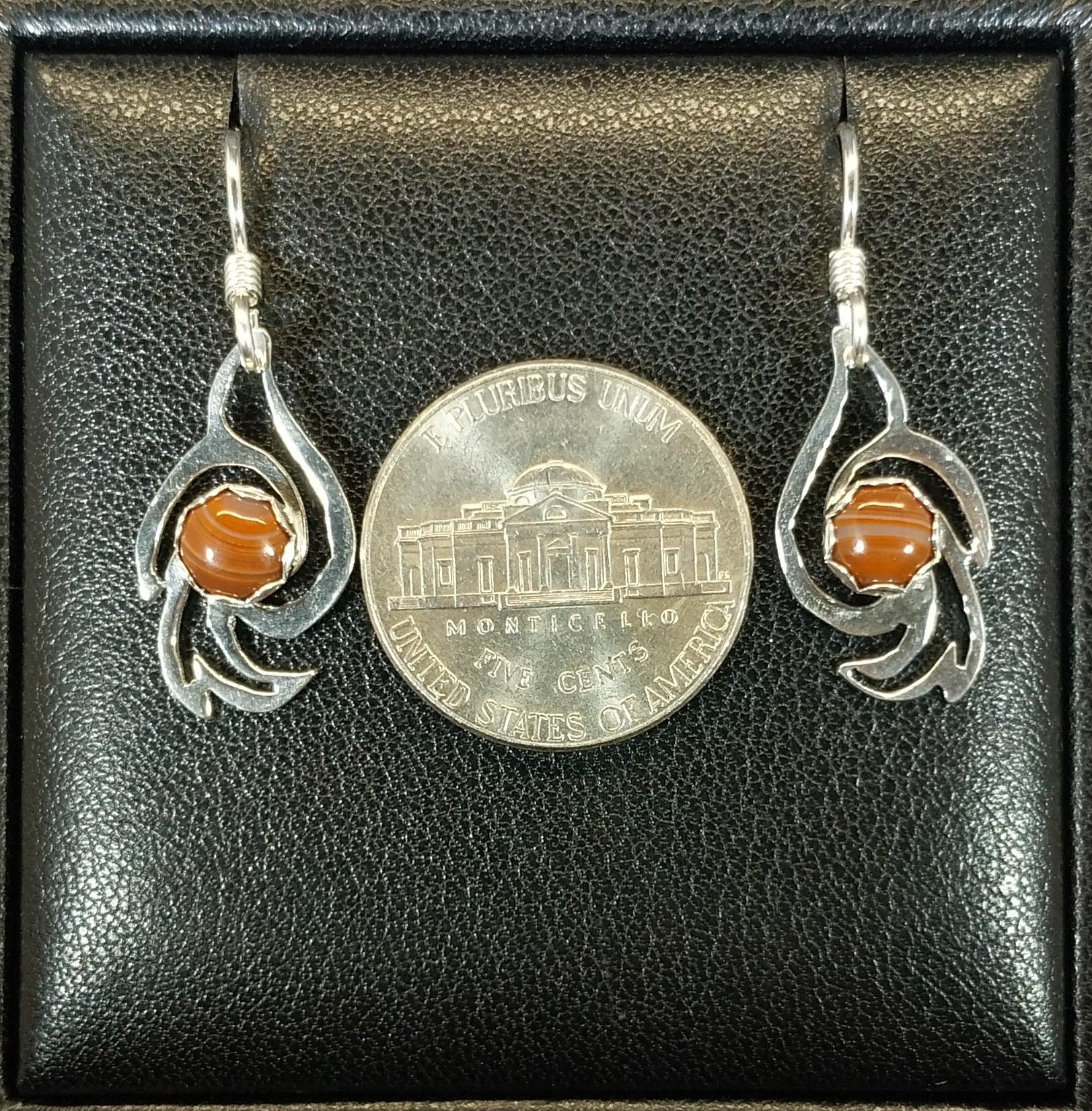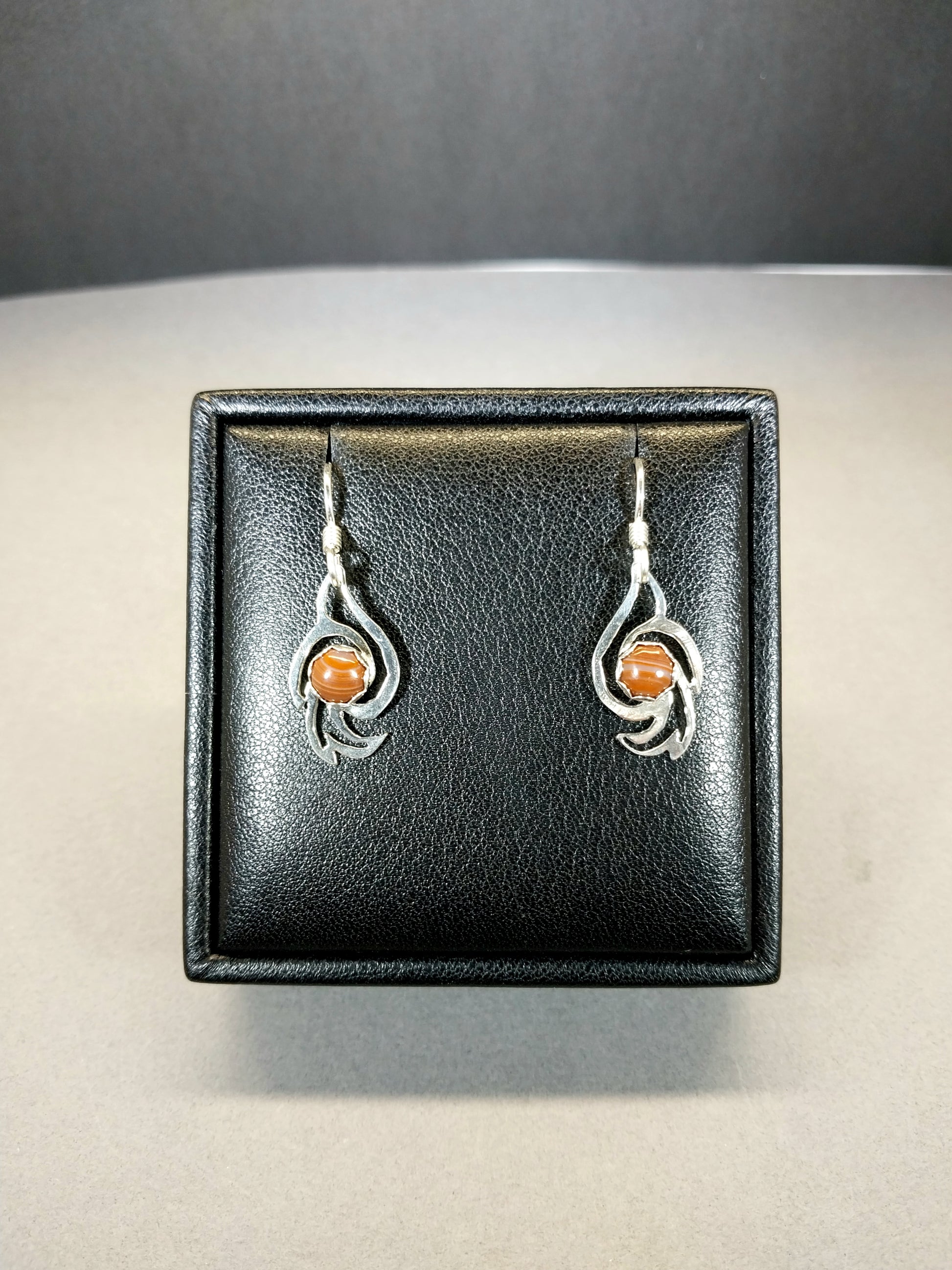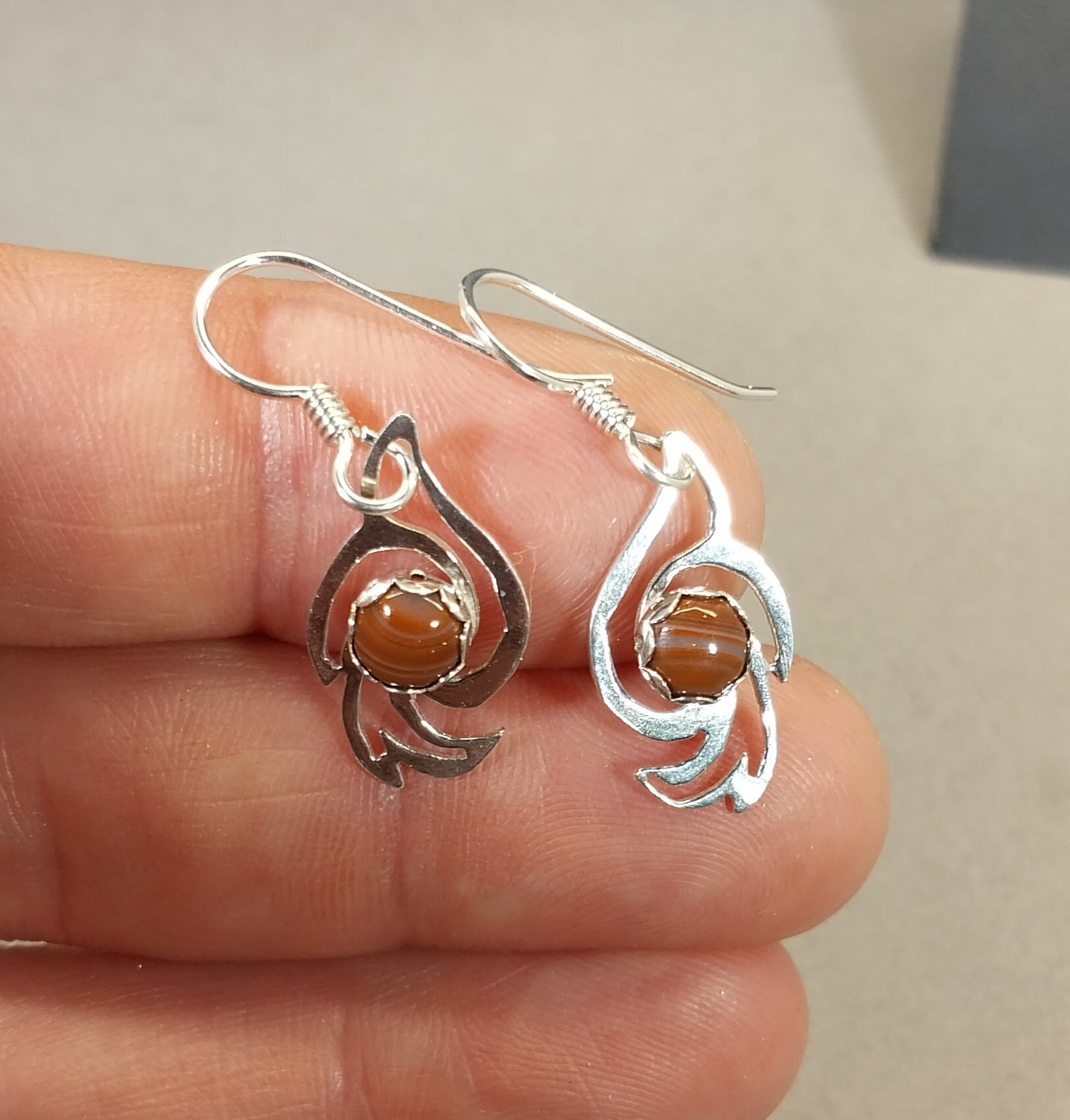 This beautiful set of Lake Superior Agate Earrings feature orange banded Lake Superior agates in solid sterling silver. The design is a dove turned vertical. I think of them as doves rising. The stones are very small at just 6 mm across. The doves measure roughly 21 mm tall. These are pieces I cut by hand from recycled sterling silver sheet that I hand forged and formed. The agates are domed and held by sterling silver bezels with scalloped edges that have a floral look. I paired them with argentium sterling silver ear wires which resist tarnish and are easy to clean. These are made from an agate we found in Wisconsin. These are small size light weight earrings that will be comfortable to wear.