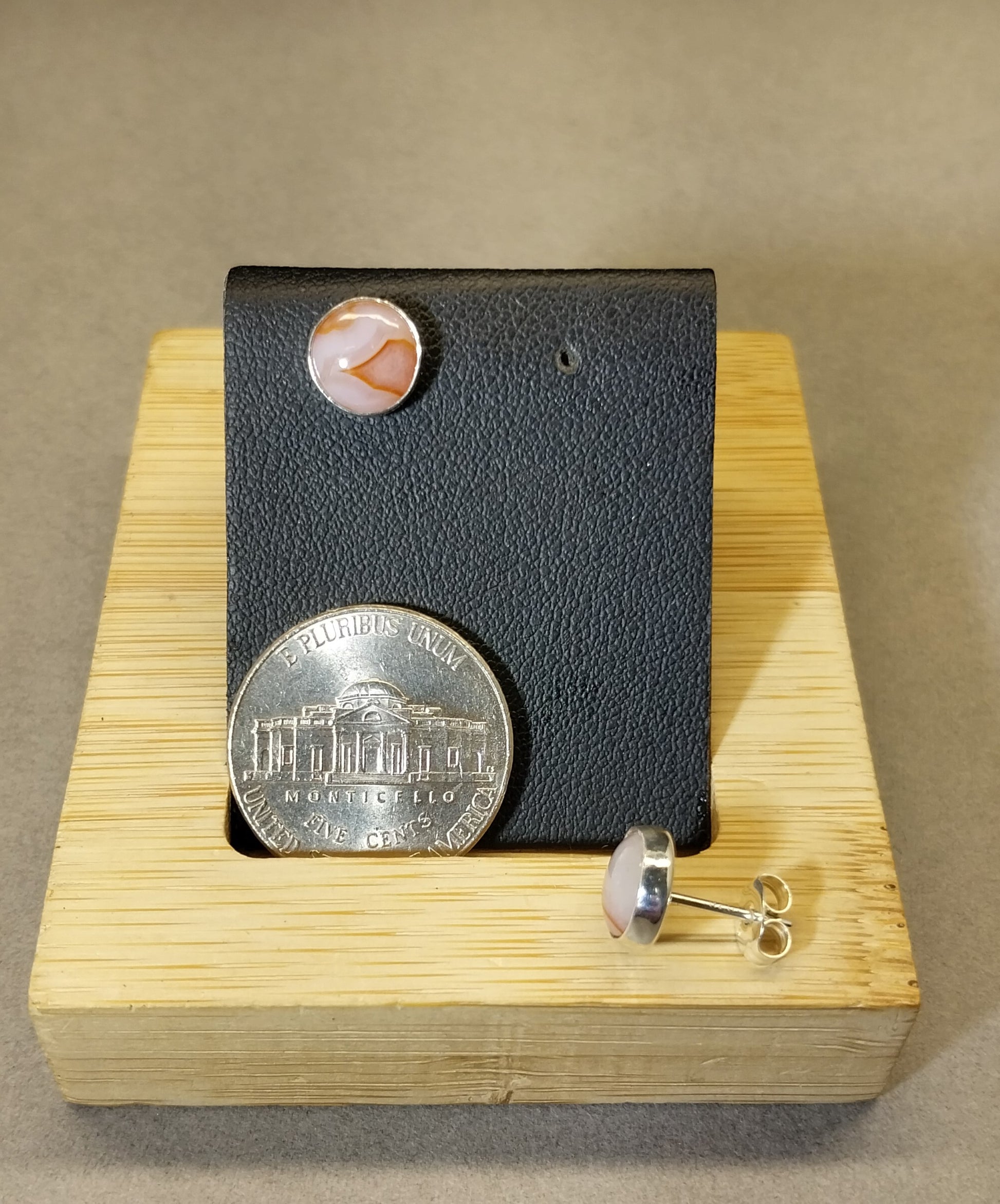 I made this set of Lake Superior agate stud earrings from a unique white and orange Lake Superior agate found in Minnesota. I cut and polished the stones in tiny 8 mm domed rounds (not perfectly round) and set them in solid sterling silver. The posts are about 10 mm long. This agate is unique in that it's more white than orange which is the opposite of most Lake Superior agates. White lakers are fairly rare. We take pictures in direct bright light that simulates what your stone will look like in sunlight. Natural stones look very different in low or artificial light. If there's not good light when you receive these you can use the flashlight feature on your smart phone to better view the stones. Lake Superior agates are natural stones that are meant to be admired in sunlight.