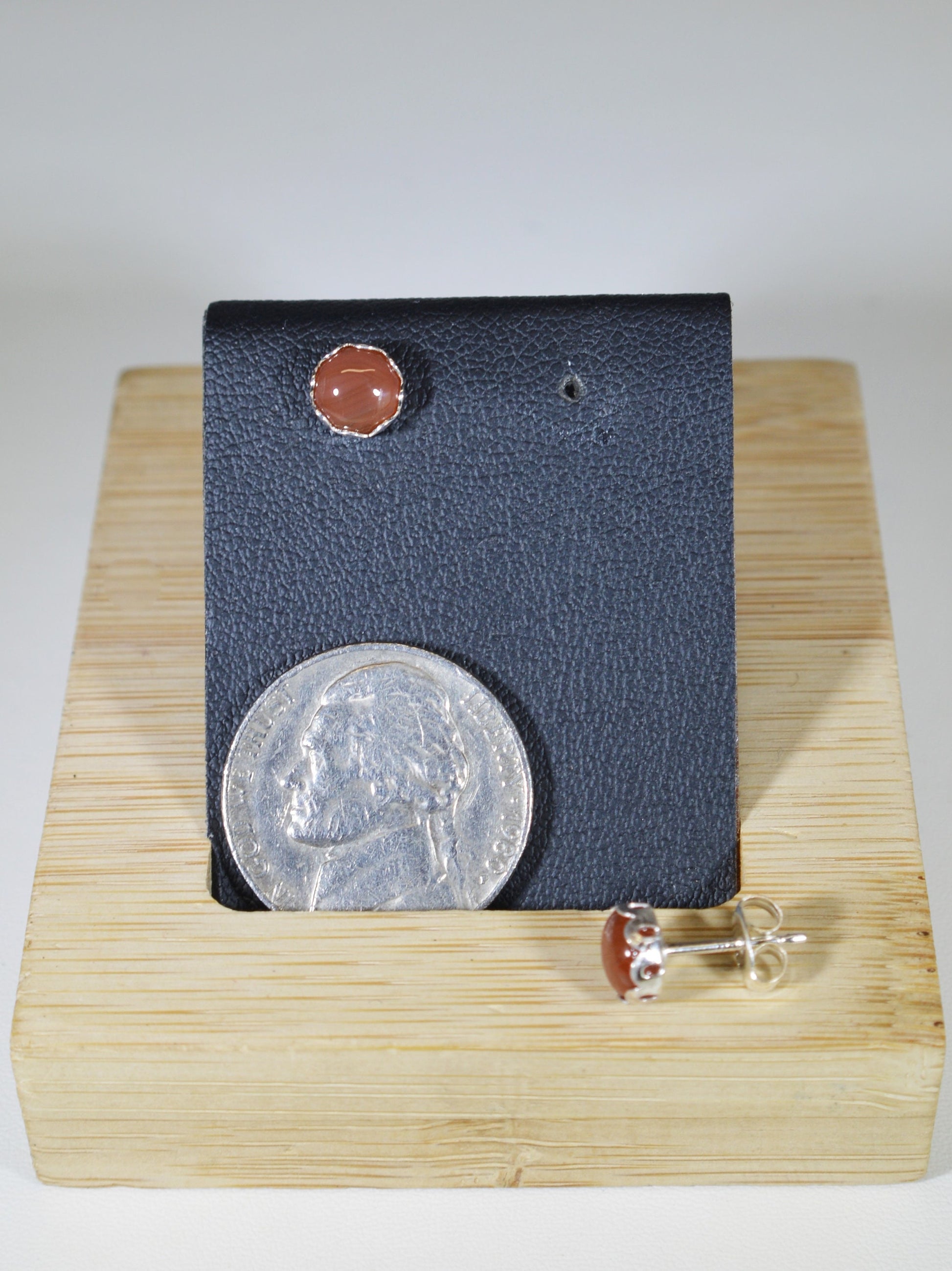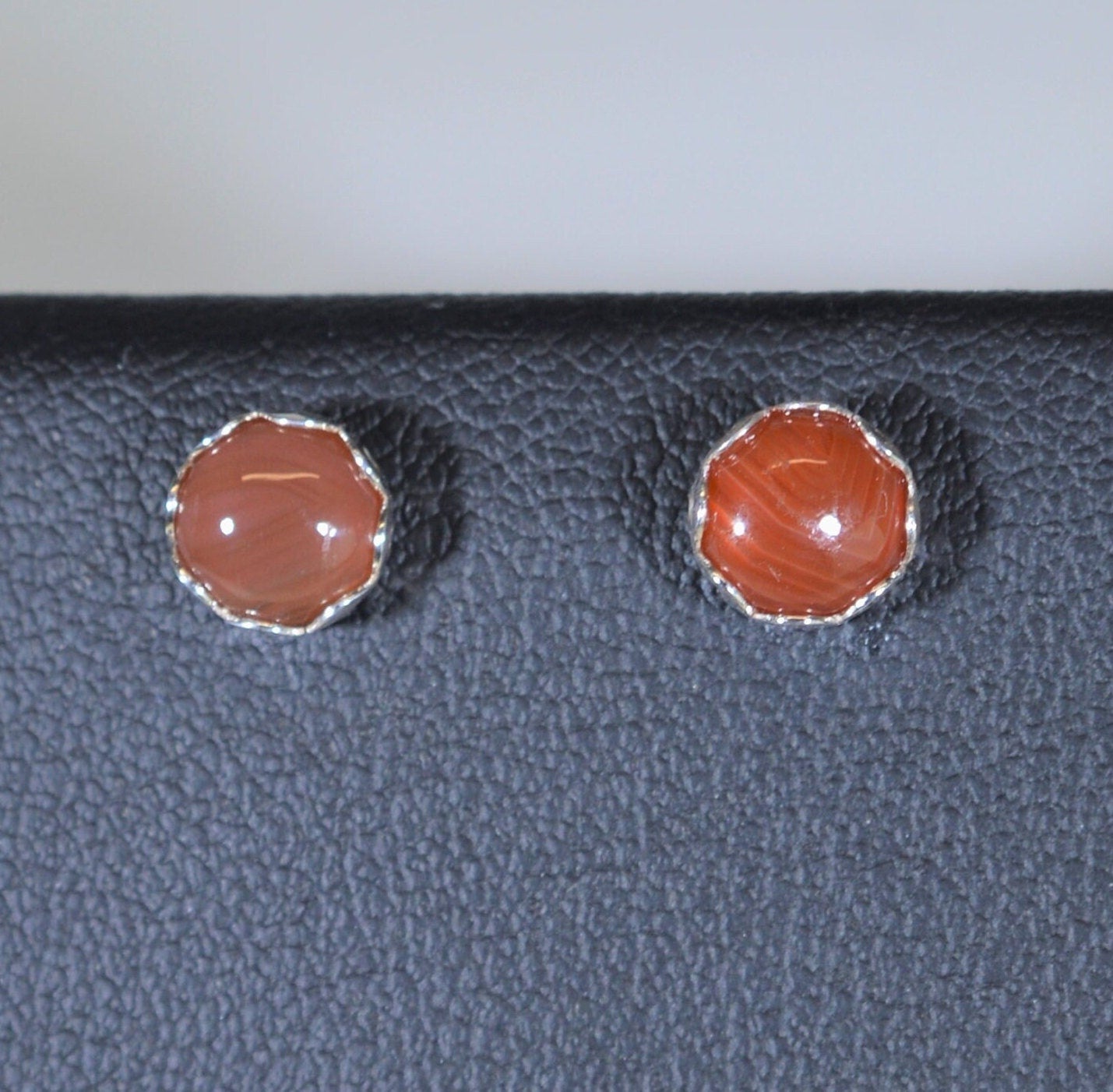 This is a set of Lake Superior agate stud earrings in solid sterling silver. The stones are nicely transparent in medium orange. They have good banding in them that's visible up close. These are cut from an agate we found on the North Shore of Lake Superior. The settings are about 6.5 mm across. The posts are about 10 mm long. We handcrafted both the settings and the stones for this pair.