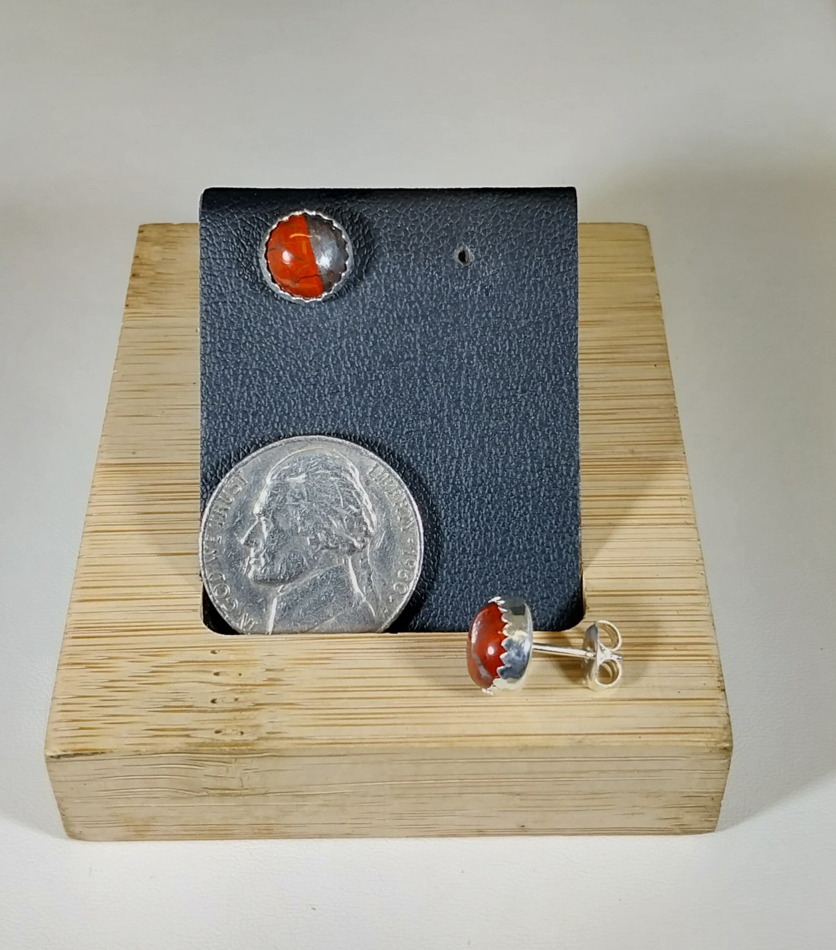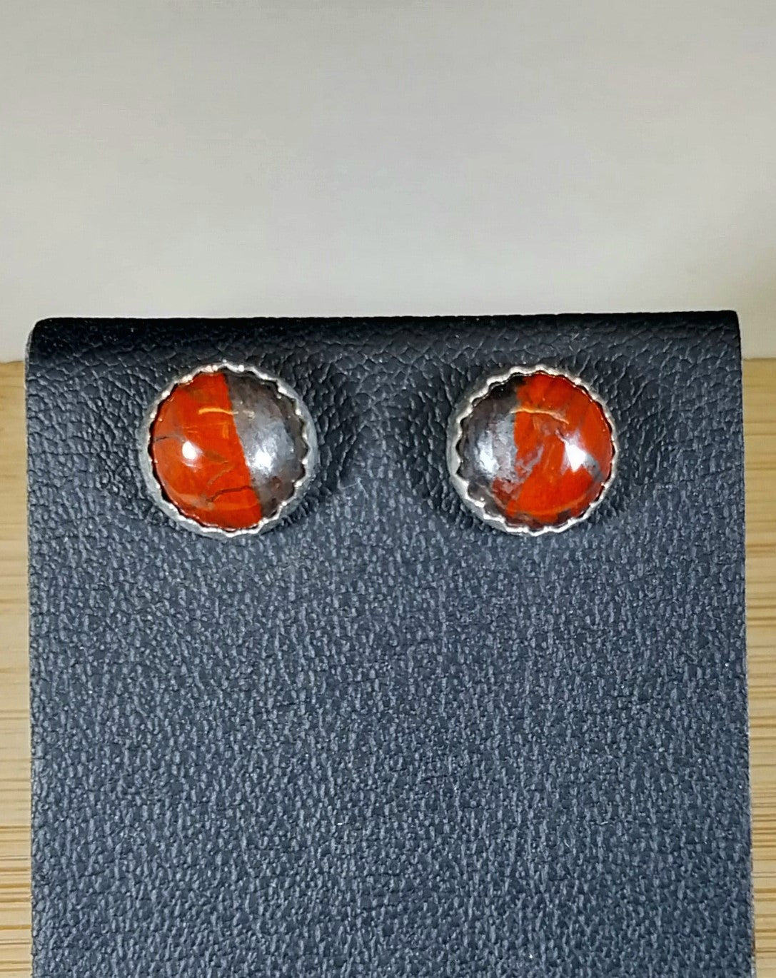 This beautiful pair of silver stud earrings feature Lake Superior jasper also known as jaspelite or iron bound jasper. This set features a stone I found that has really vibrant color that's between red and orange as well as the gunmetal iron color. I crafted the settings with solid sterling silver. The bezels are a serrated edge design and are about 8.5 mm across. The posts are about 10 mm long.