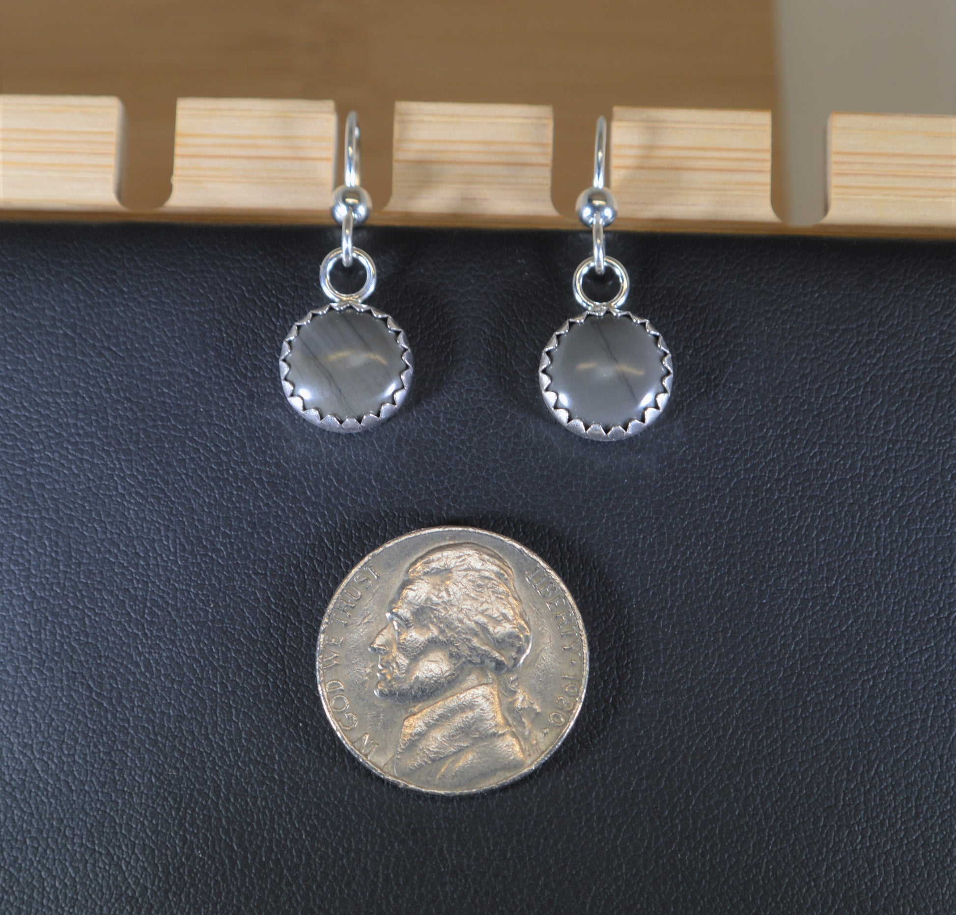 We're once again out rock hounding from Michigan's UP through WI and up the north shore of Minnesota. I made these natural slate silver earrings from a stone found on the south shore of Lake Superior in the UP of Michigan. This is one of my favorite stones to cut and has historically been very popular for us because gray goes with just about everything. These are a light to medium gray with darker lines that run through them. This is one of the rarer stones I find especially one that's jewelry grade like what these came from. There's just one beach where I find it and usually it's small pieces. I got lucky and found a good sized piece this year. The stones for this set are about 10 mm across. The settings are solid fine silver. The ear wires are surgical steel. These are great for those who love natural stones but desire something a bit more subdued than say lake superior agates or jaspers.