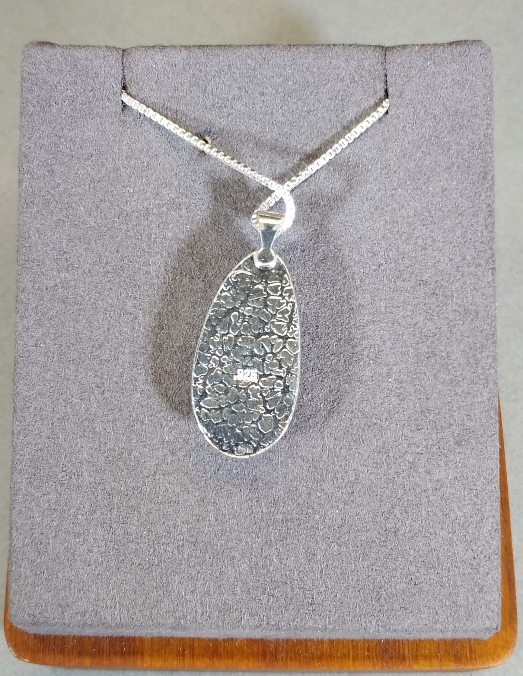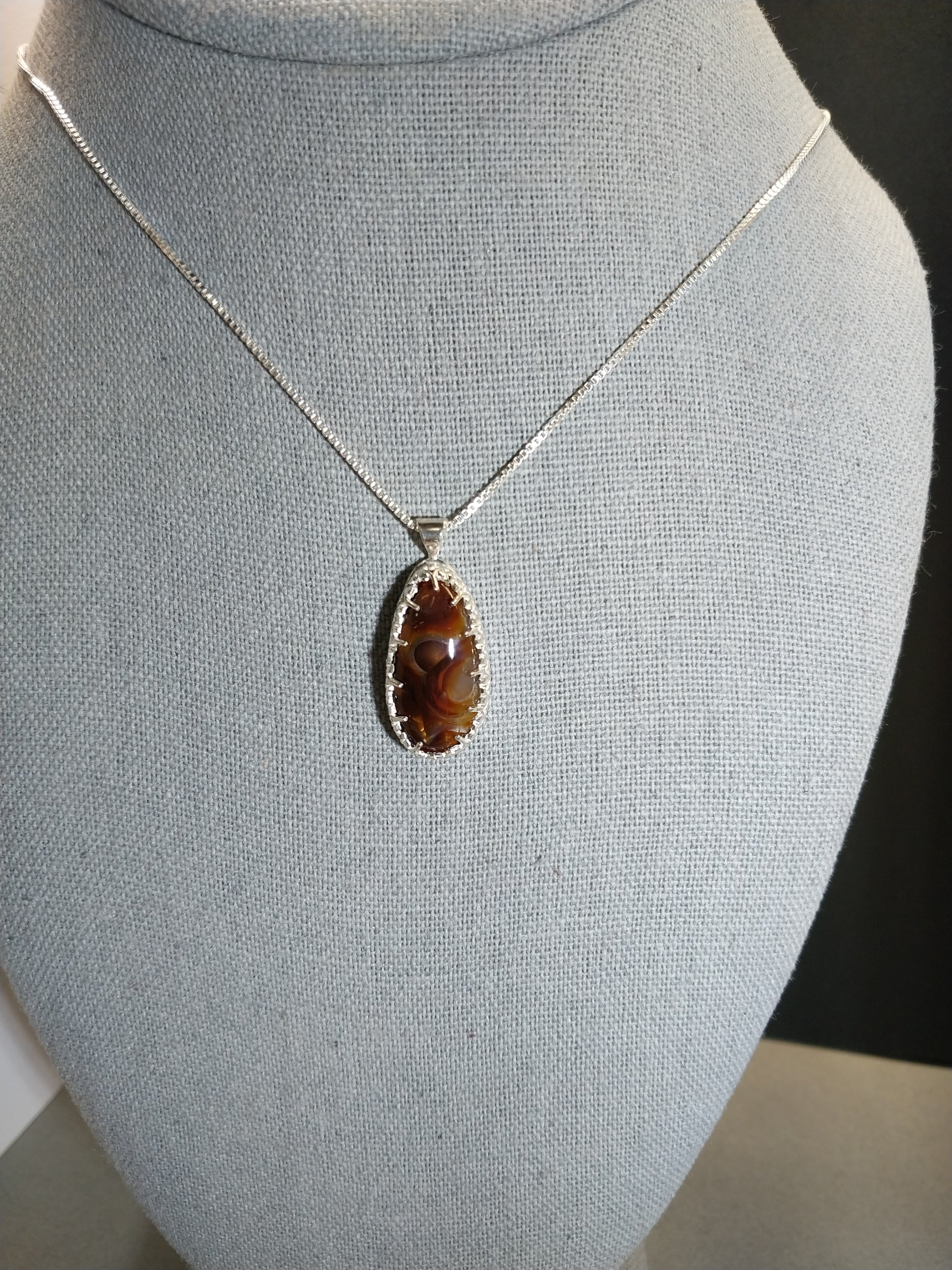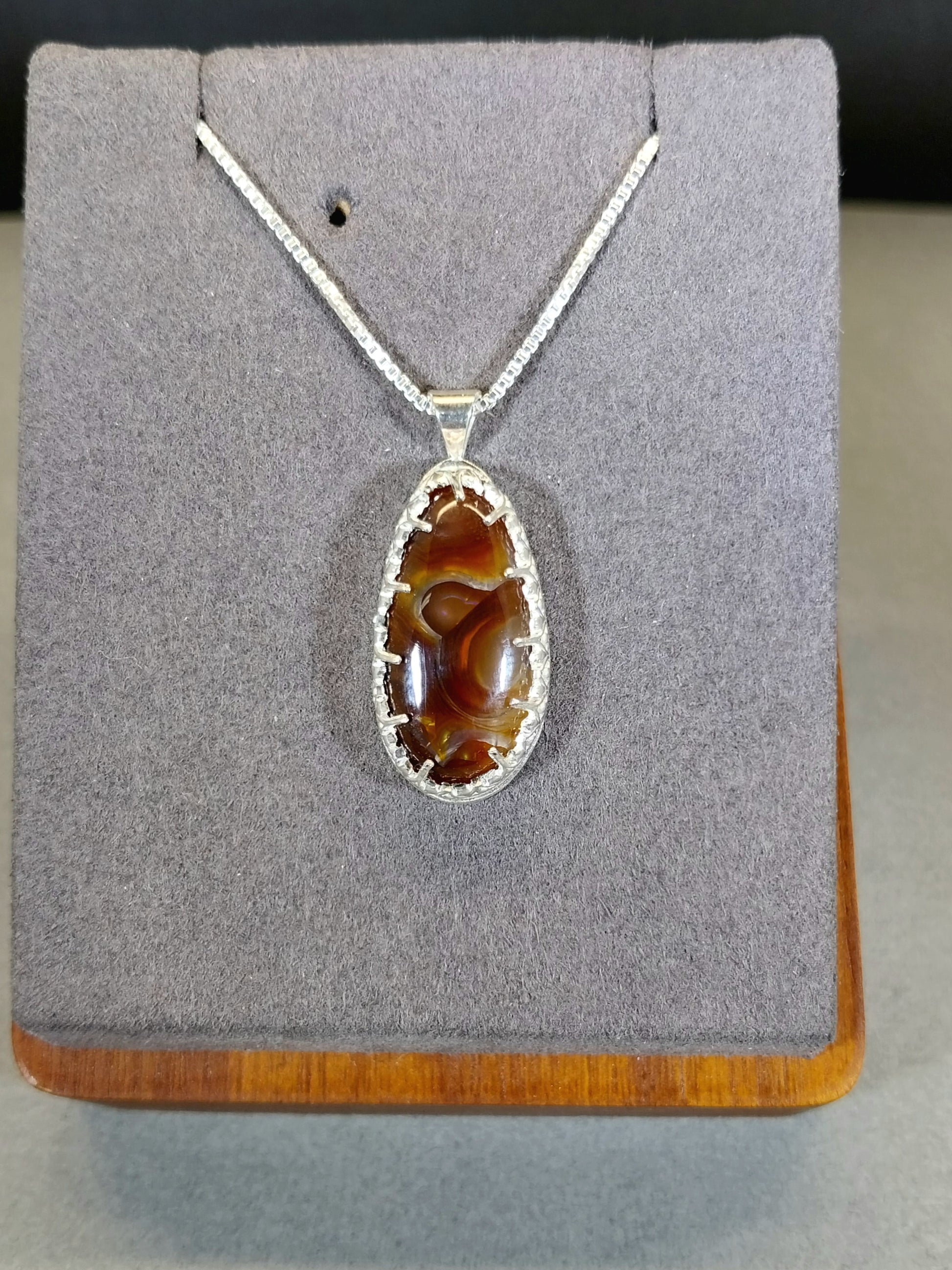 This necklace features a Mexican fire agate that I cut in a domed elongated teardrop shape. The stone has fire within the eye in the top center and some at the bottom left as well as some unique agate patterns in white and brown. The fire in the eye feature is subtle but pretty and seems to change color based on the orientation. I've seen green and a bit of purple there. You may need sunlight to see it best. This pendant measures about 30 x 13 in mm or is about 1.2 inches tall. The included chain is solid sterling silver and is 20 inches in length. I crated the back of this setting using recycled sterling silver that I hand forged and formed then textured (see the picture of the back). I used a decorative bezel to hold the stone which I altered to give it a prong set look. Fire agate need bright direct light to shine at it's best. View it in sunlight tipping the pendant back and forth or if it's dark when it arrives use the flashlight feature on your phone to best see the fire within it. Picture props such as necklace holders are not included.
