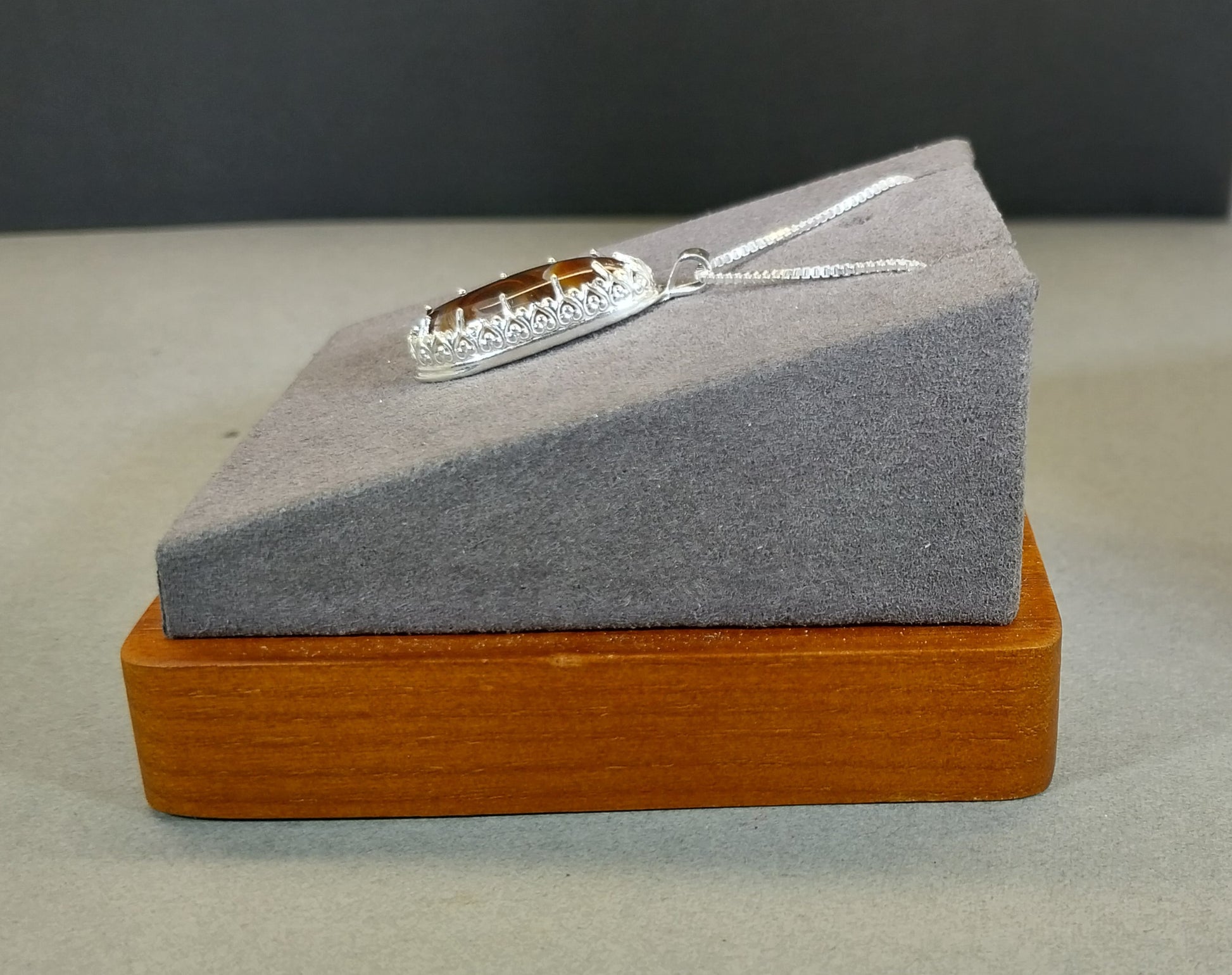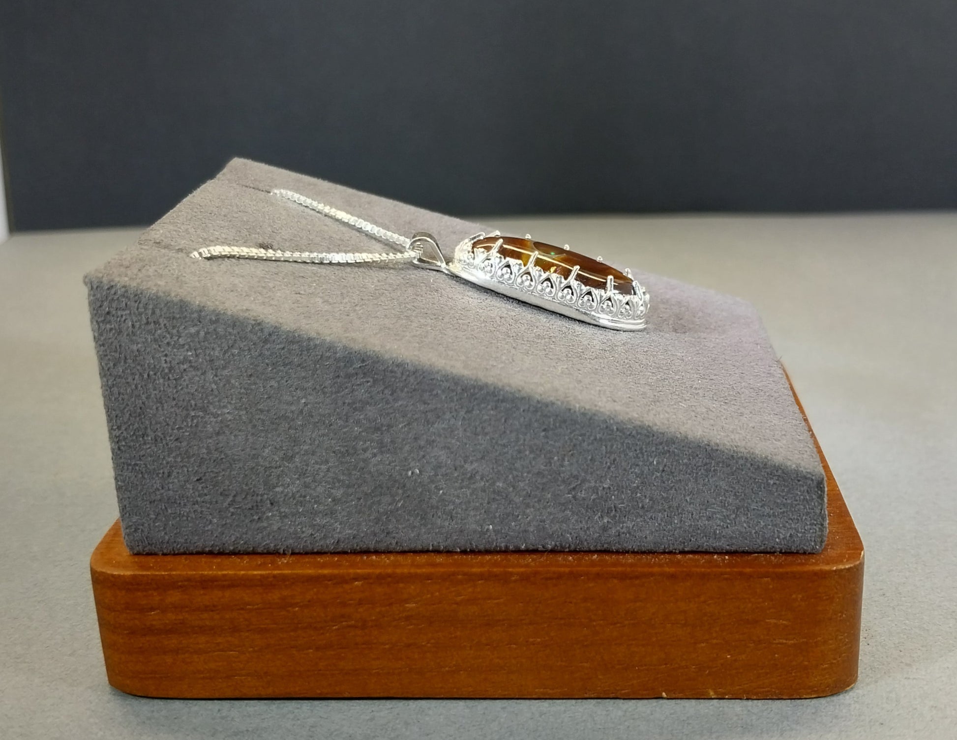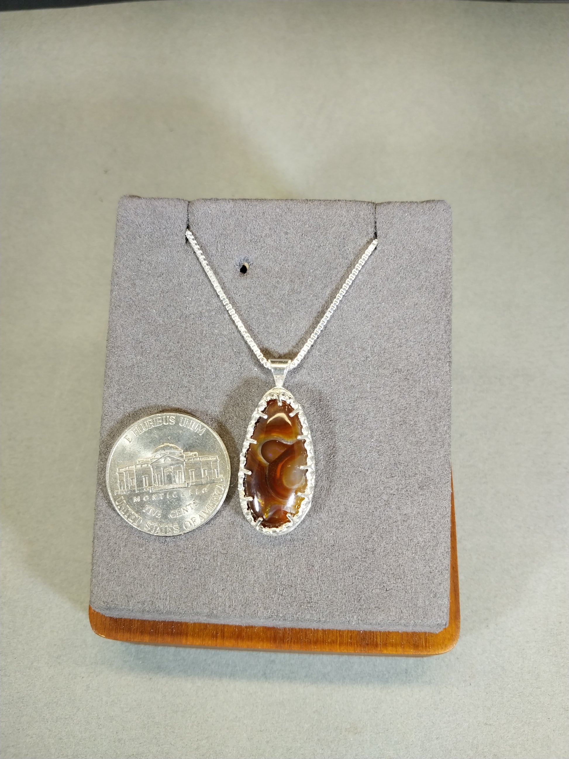 This necklace features a Mexican fire agate that I cut in a domed elongated teardrop shape. The stone has fire within the eye in the top center and some at the bottom left as well as some unique agate patterns in white and brown. The fire in the eye feature is subtle but pretty and seems to change color based on the orientation. I've seen green and a bit of purple there. You may need sunlight to see it best. This pendant measures about 30 x 13 in mm or is about 1.2 inches tall. The included chain is solid sterling silver and is 20 inches in length. I crated the back of this setting using recycled sterling silver that I hand forged and formed then textured (see the picture of the back). I used a decorative bezel to hold the stone which I altered to give it a prong set look. Fire agate need bright direct light to shine at it's best. View it in sunlight tipping the pendant back and forth or if it's dark when it arrives use the flashlight feature on your phone to best see the fire within it. Picture props such as necklace holders are not included.