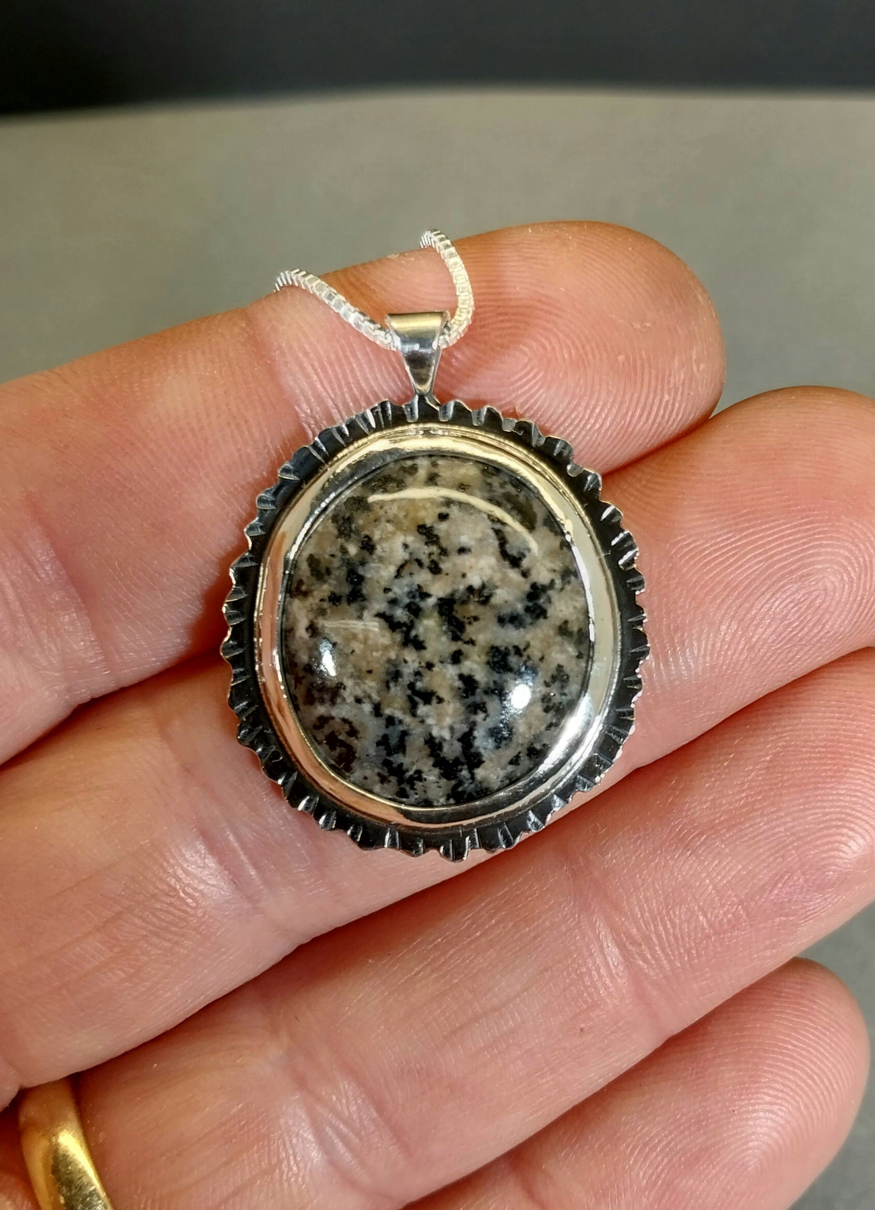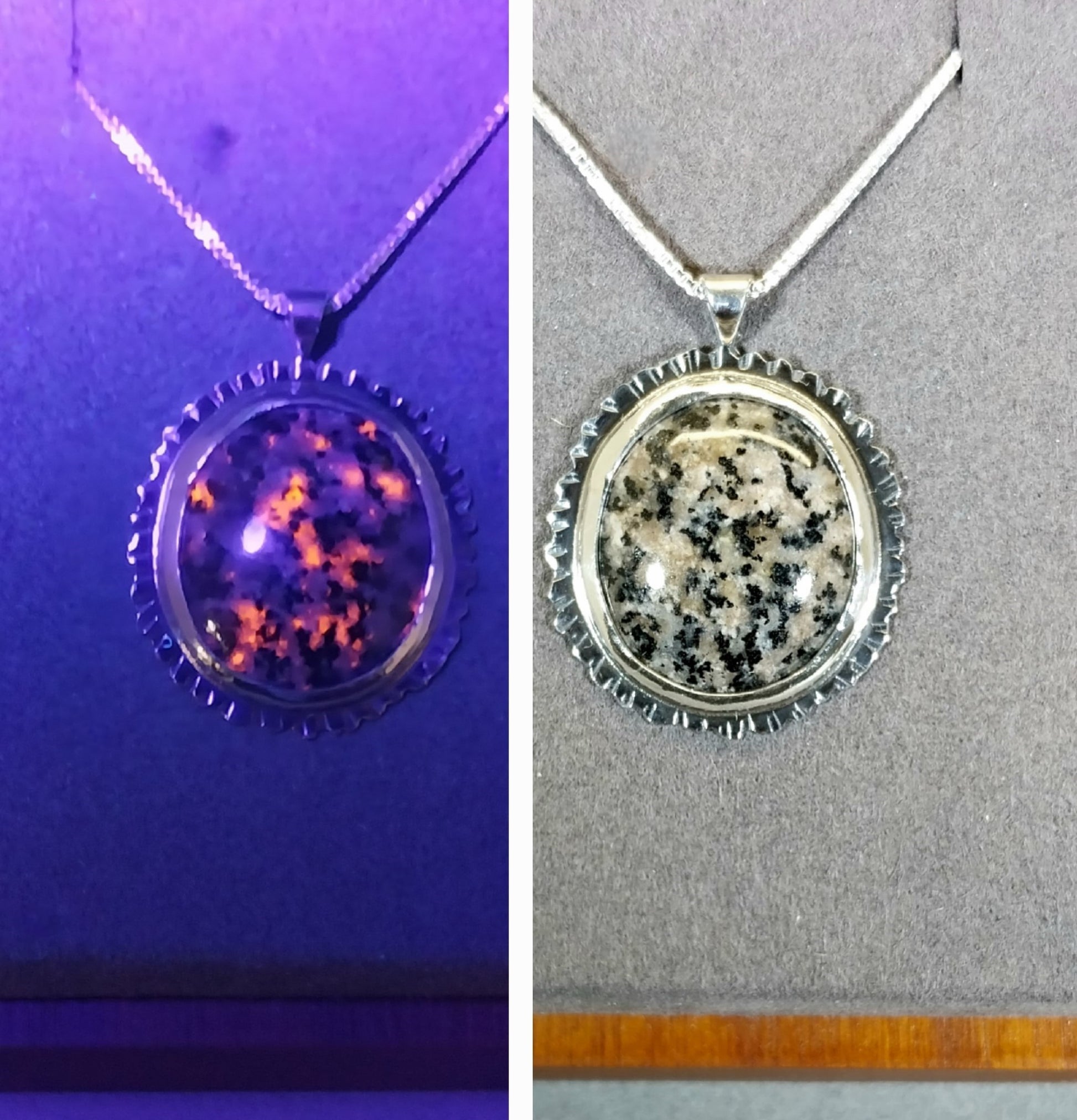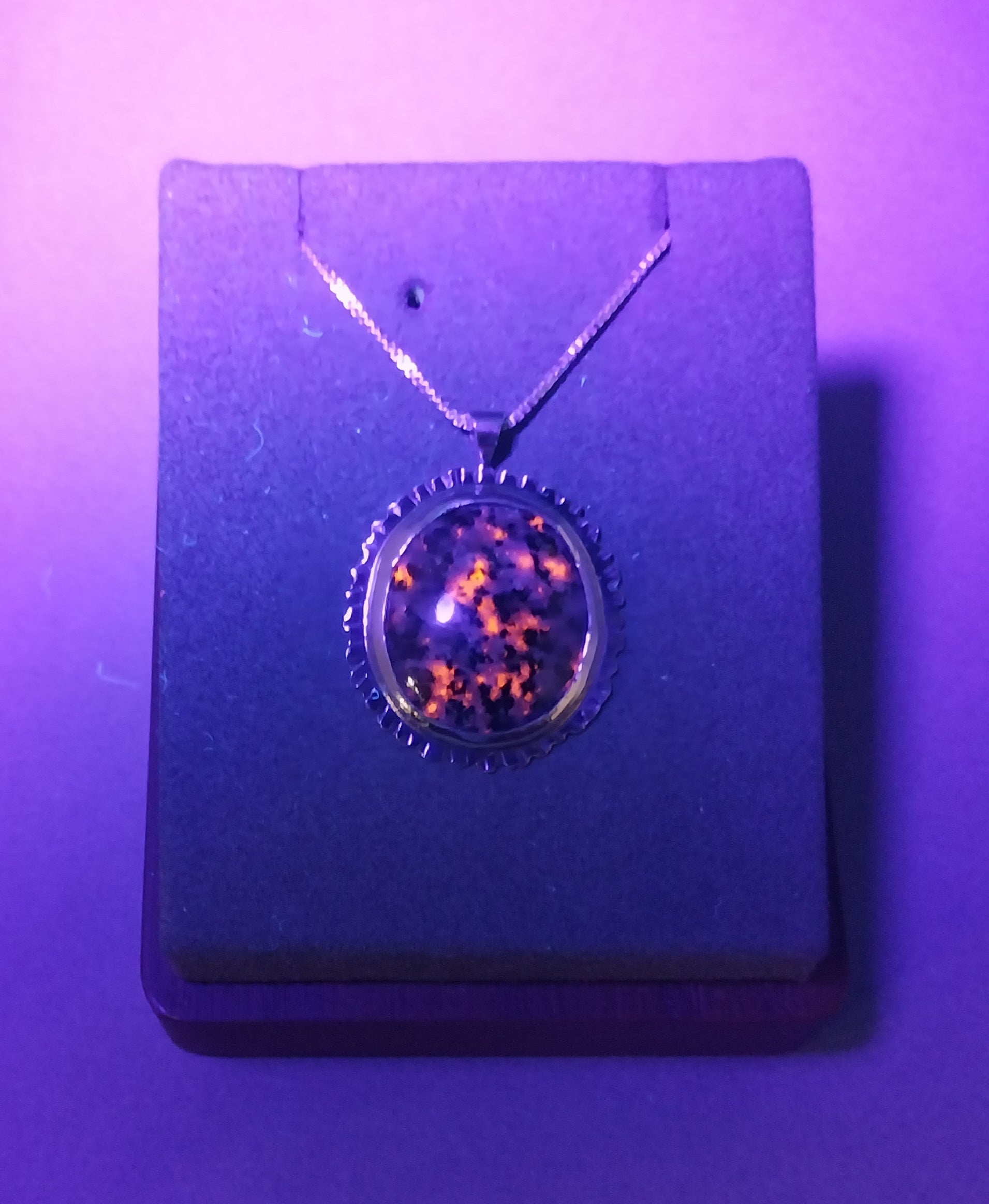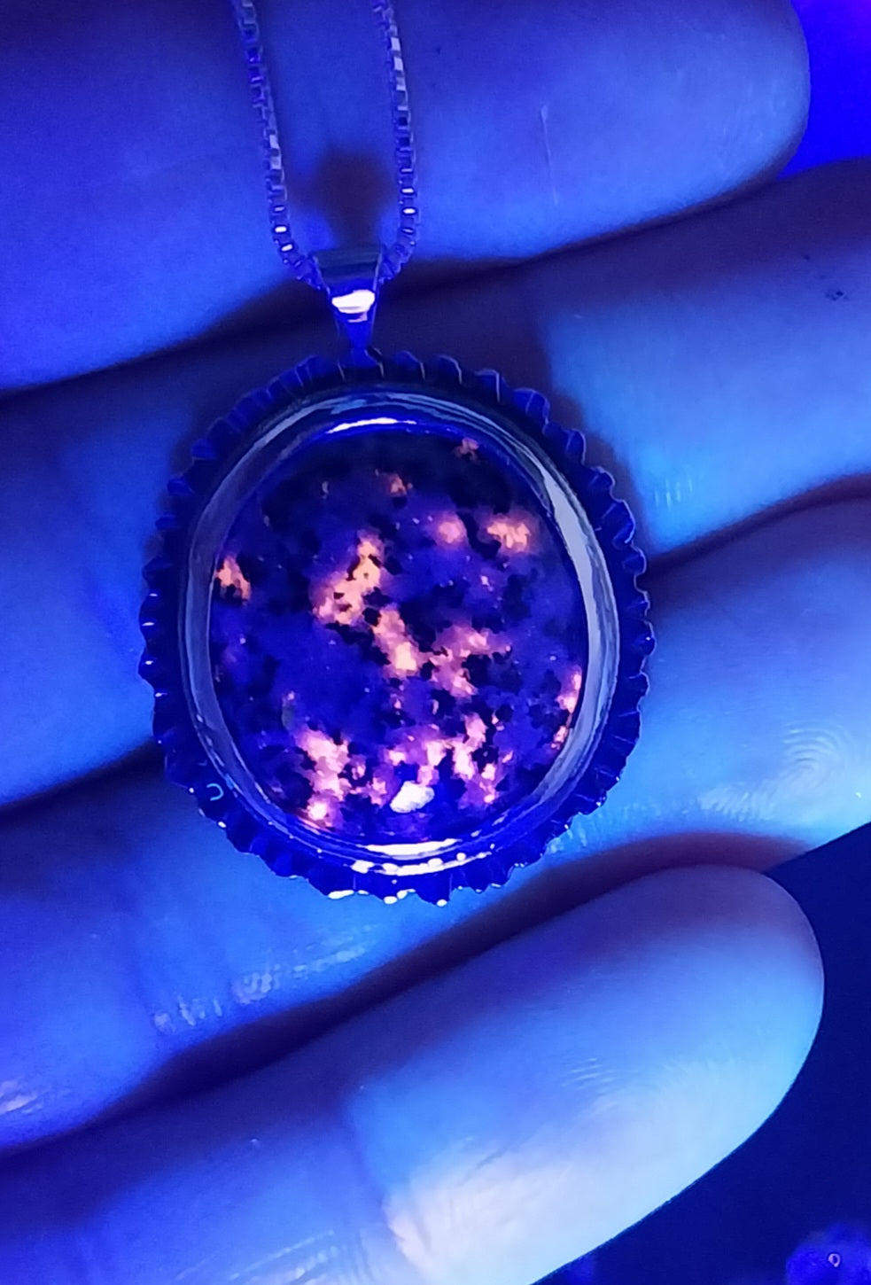 This is a Lake Superior sodalite in syenite necklace also known as Yooper Stone or Emberlite. We call them lumenite :). I shaped this stone from a beach stone we found on the shore of Lake Superior. This is a large sized domed oval with the stone being about 22 x 20 in mm. The setting that holds it is solid sterling and fine silver. The back of the piece is textured with a northern pine tree forest design. This is a really pretty stone! I incorporated recycled silver into the setting design. The pendant measures about 32 x 26 mm. A 20 inch solid sterling chain is included. The first picture shows what this necklace looks like under UV black light vs indoor light. The front edge of this piece is hand sawn and hand stamped. I antiqued the silver (intentional darkening of the silver) then polished it to bring out the details in the recessed textured areas.