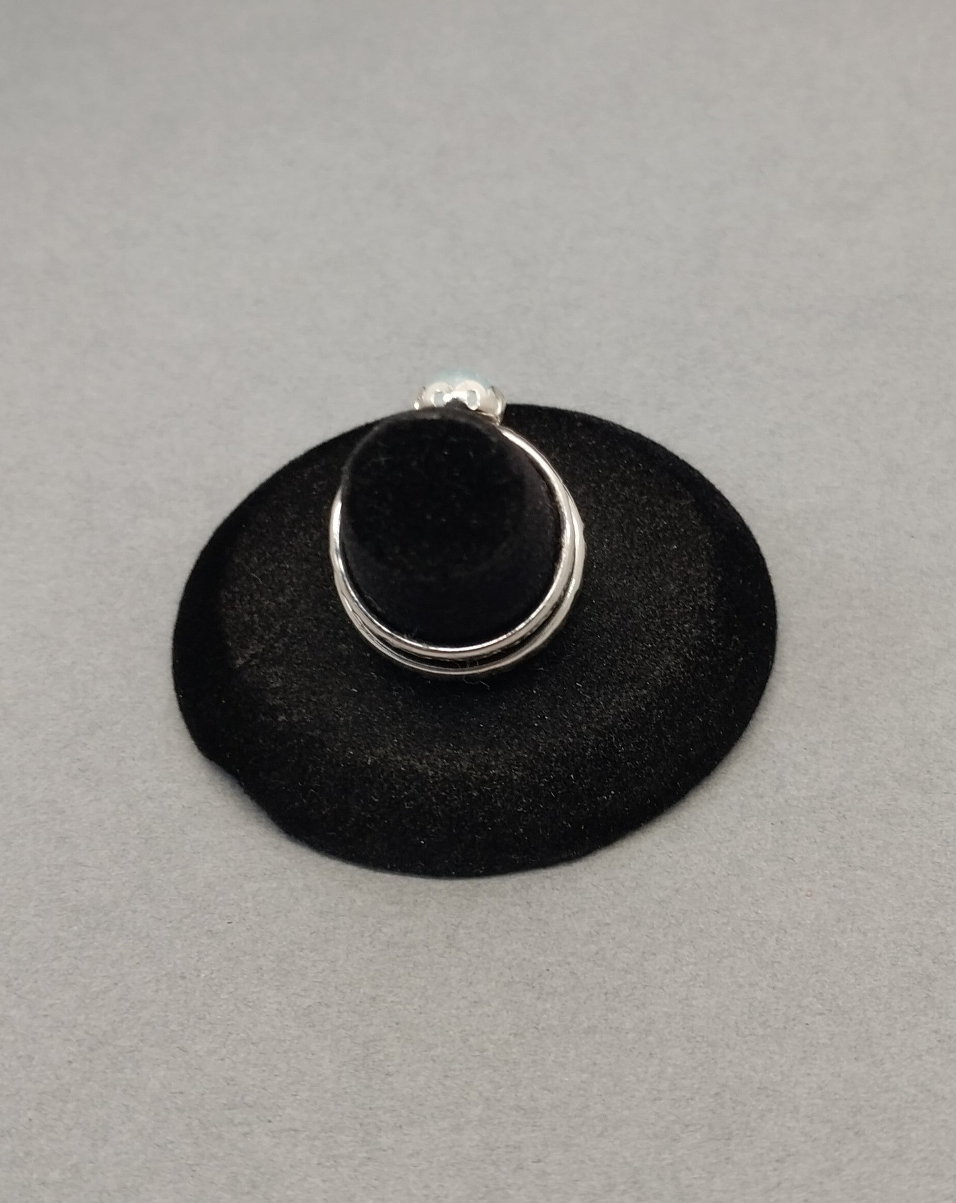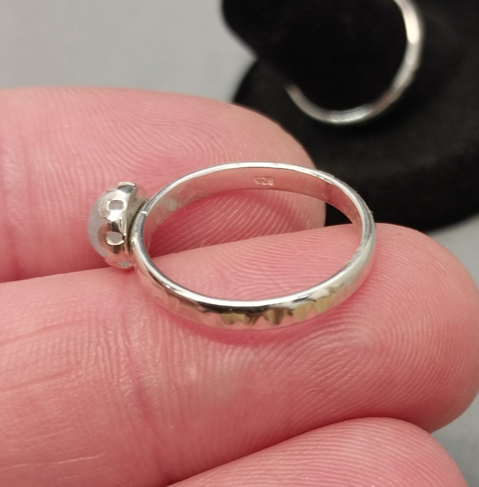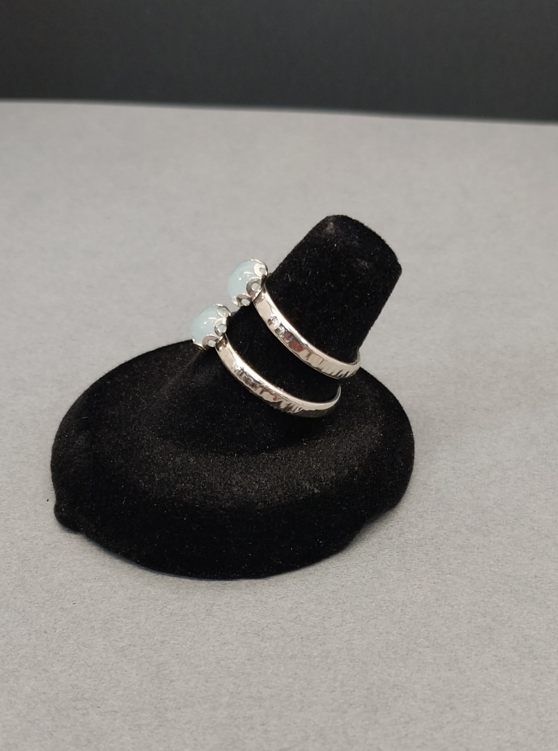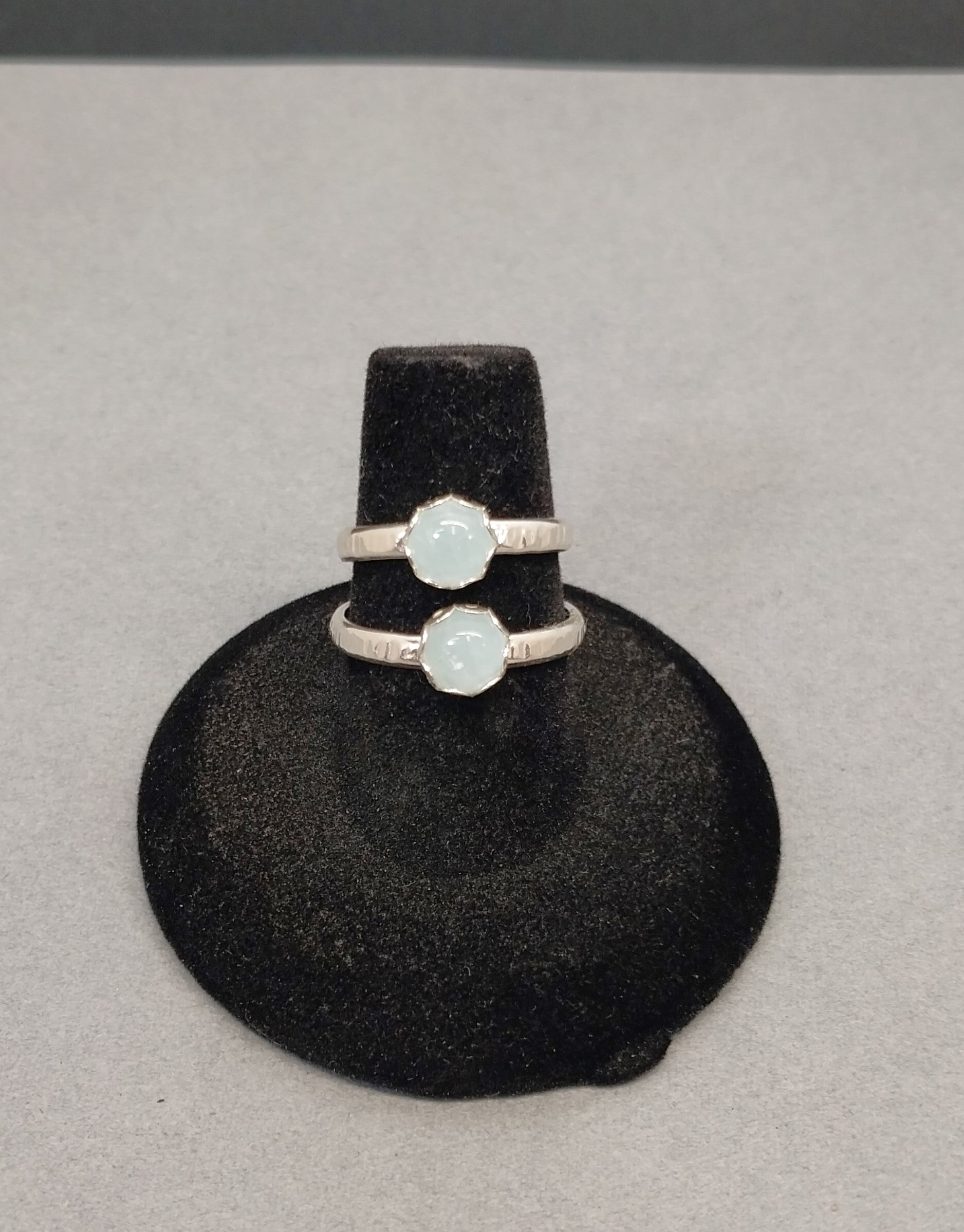 These are pretty little rings made for daily wear. These are handmade by me using natural stones and solid 925 sterling silver. Add some sky blue to your jewelry box and support an artist without breaking the bank. These are size 5 1/2 and 7 1/2. These are tiny stones at about 6 mm across. The ring bands are about 2.4 mm wide. I hand hammered the bands. The settings are scalloped bezels in a flower shape design.