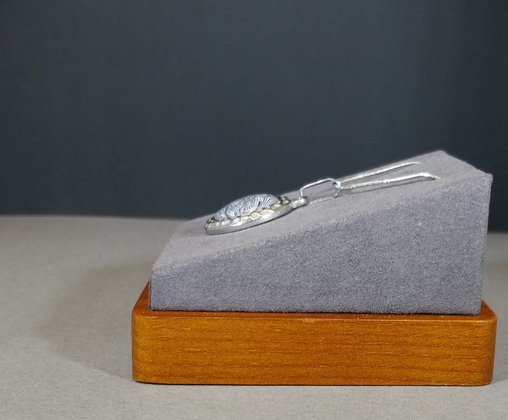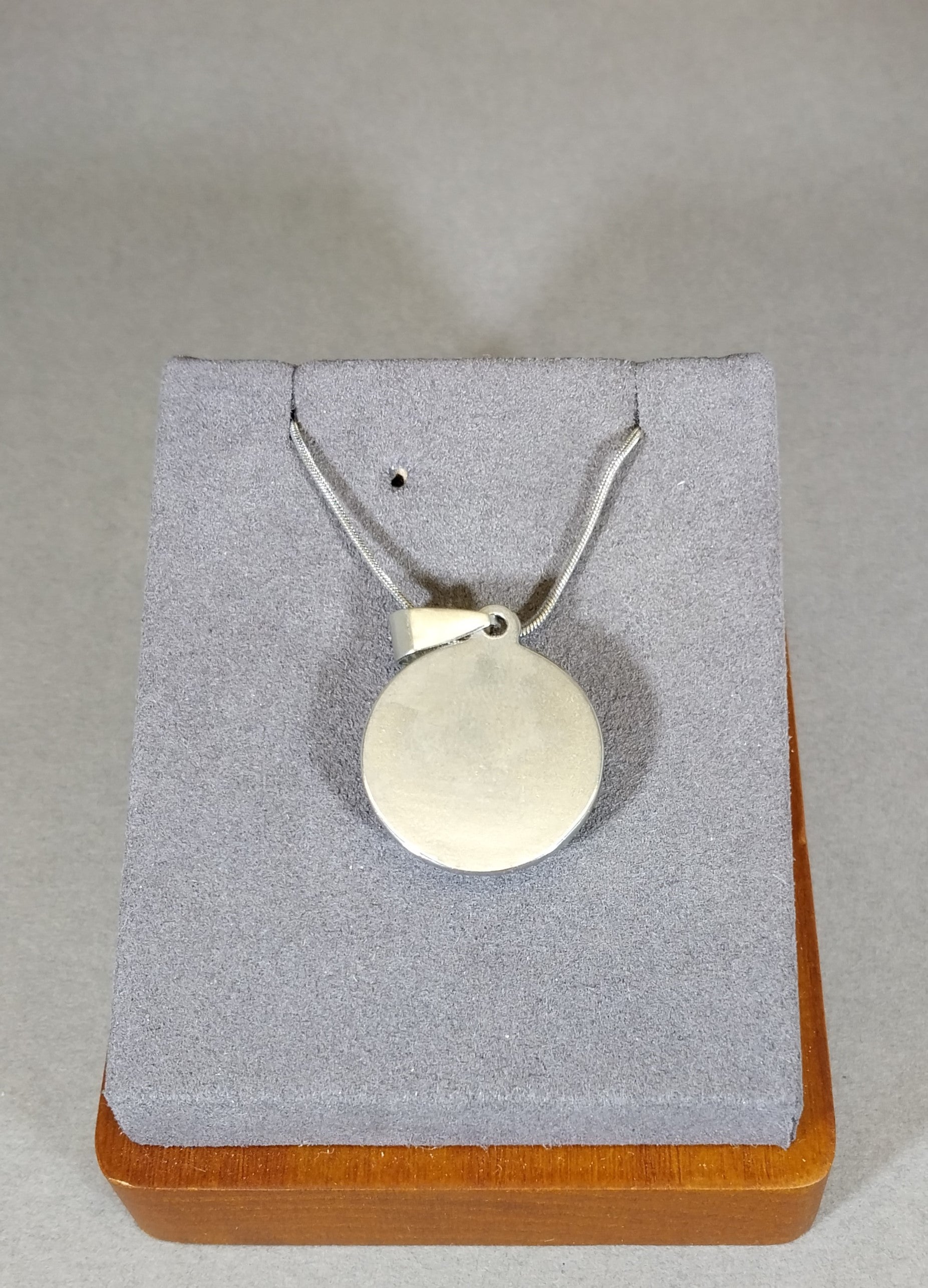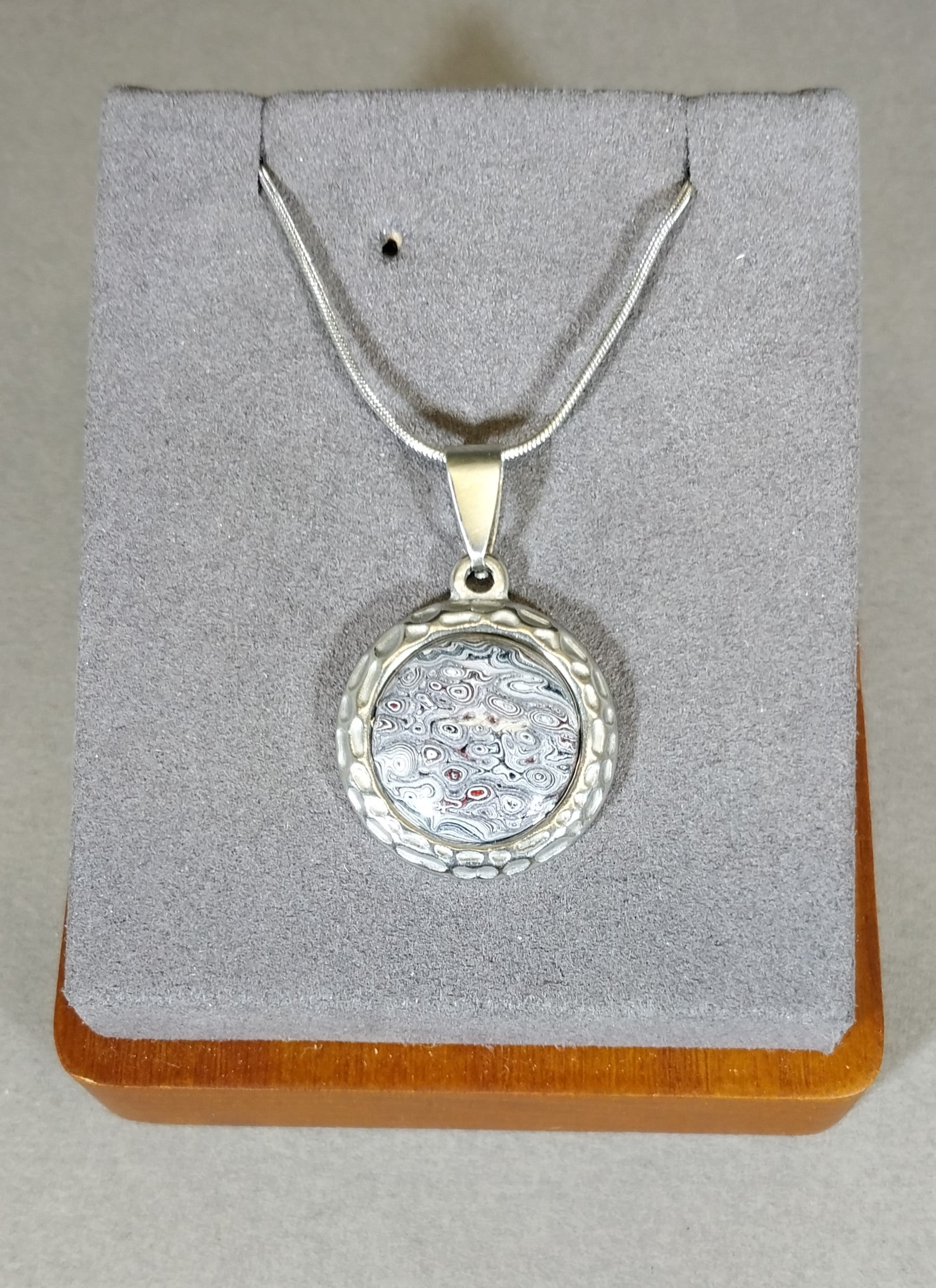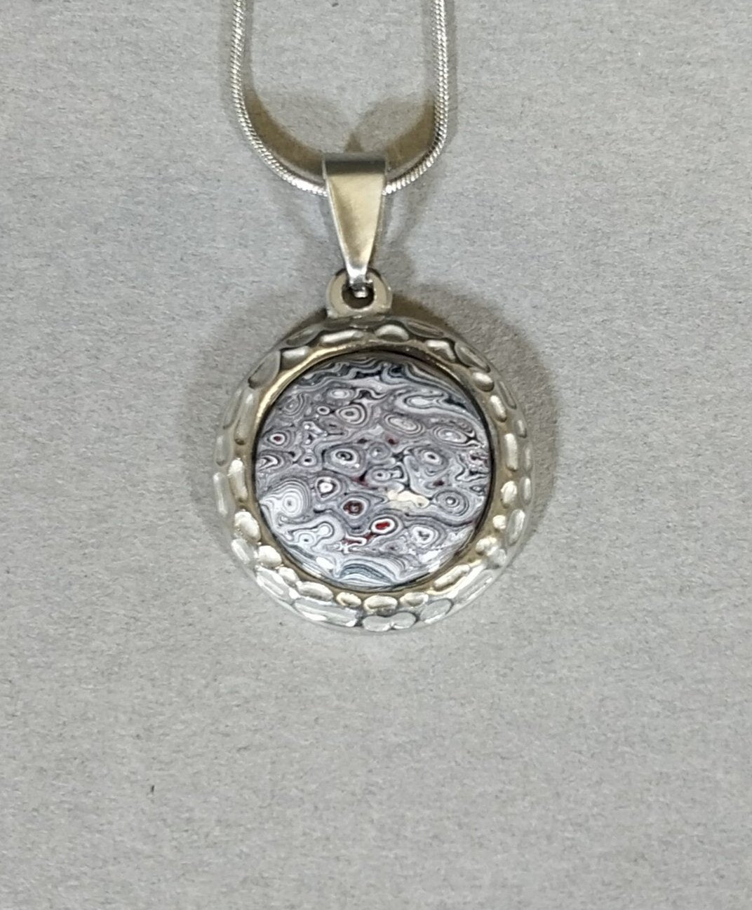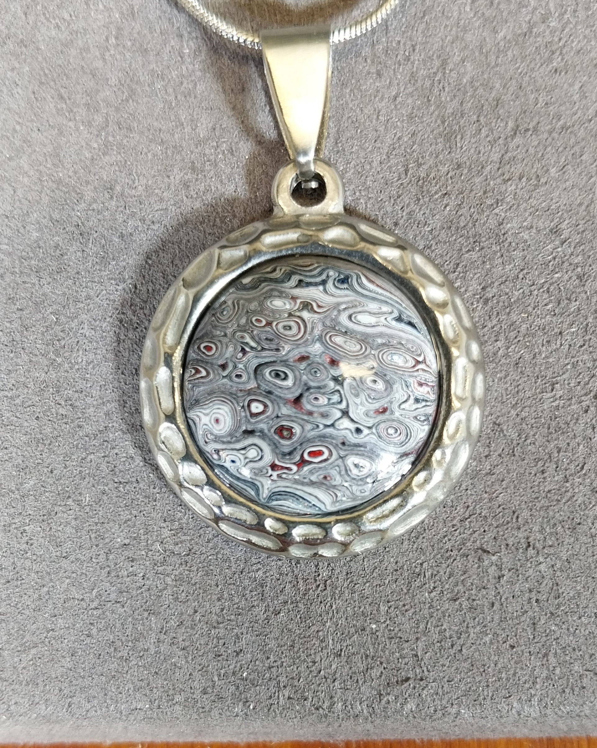 This small fordite pendant is made from Michigan sourced paint overspray. The fordite is top domed and set it in stainless steel. There is a good amount of metal flake in this fordite that sparkles in direct light. It has very detailed patterns in fine layers. The fordite is from the F series of trucks. The included 20 inch snake chain is stainless steel. This pendant is about 22 mm across with a 16 mm stone.