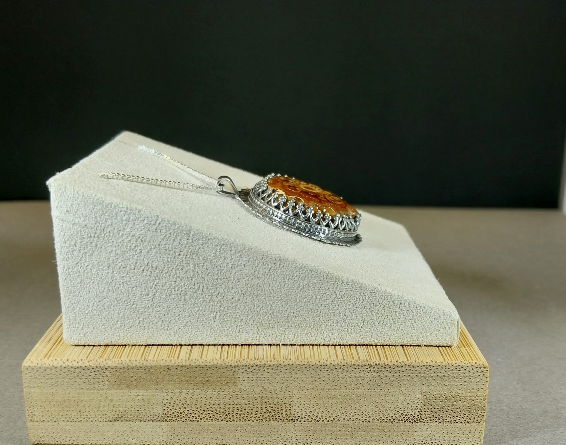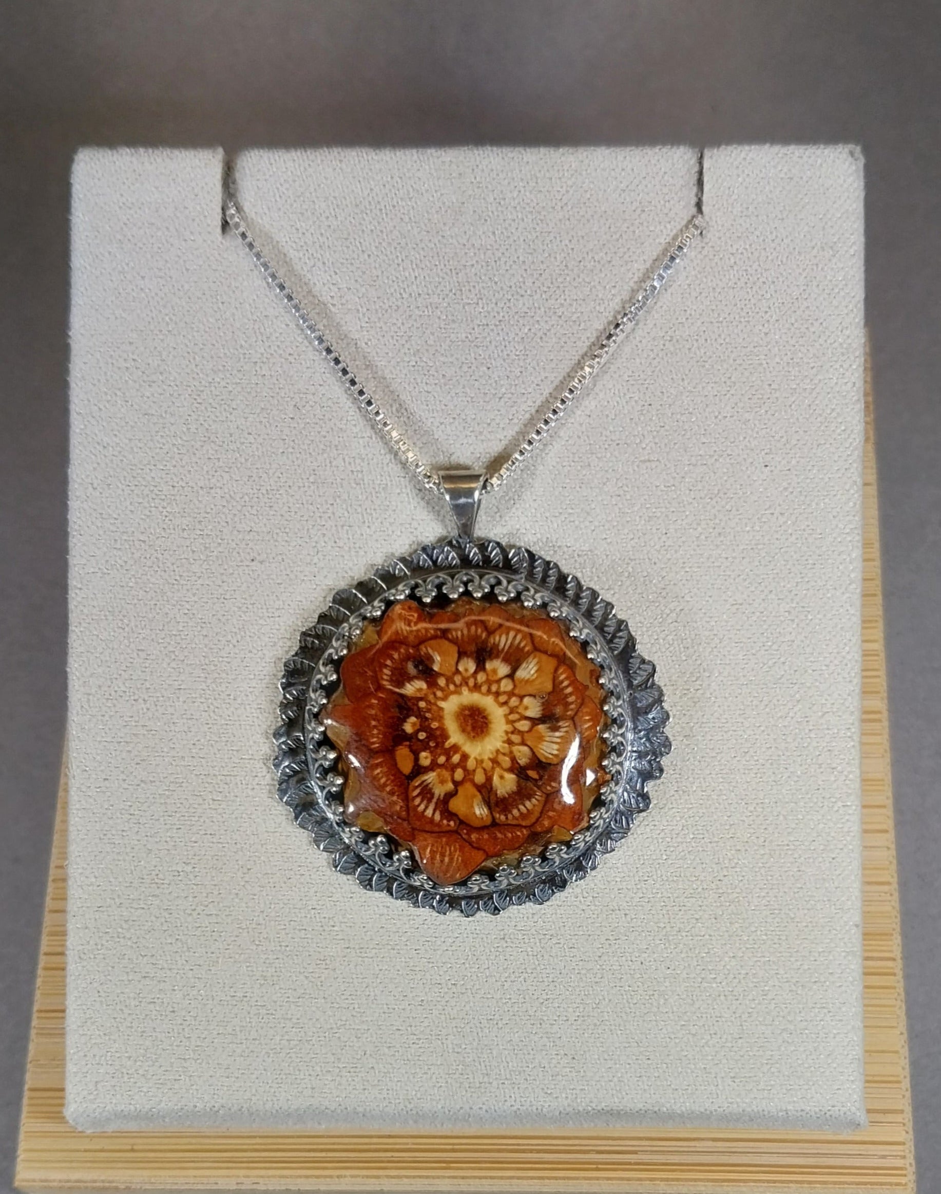 This is a really unique necklace featuring a slice of Minnesota pine cone and solid sterling silver. I used a decorative gallery bezel to hold the pine cone. The edge of the setting is hand stamped. I textured the back with a northern forest design then reticulated the silver (brought it to just below melting point) to add a look of precipitation in the pines. Think of it as whichever is relevant to the season you're wearing it in. This piece includes some recycled sterling silver sheet that I made myself. The pine cone is coated with resin. I antiqued the silver (intentionally darkened) to bring out the details I added to this piece. The pictured 20 inch chain is solid sterling silver. The pendant measures about 34 x 30 in mm or is about 1.3 inches tall including the bail.