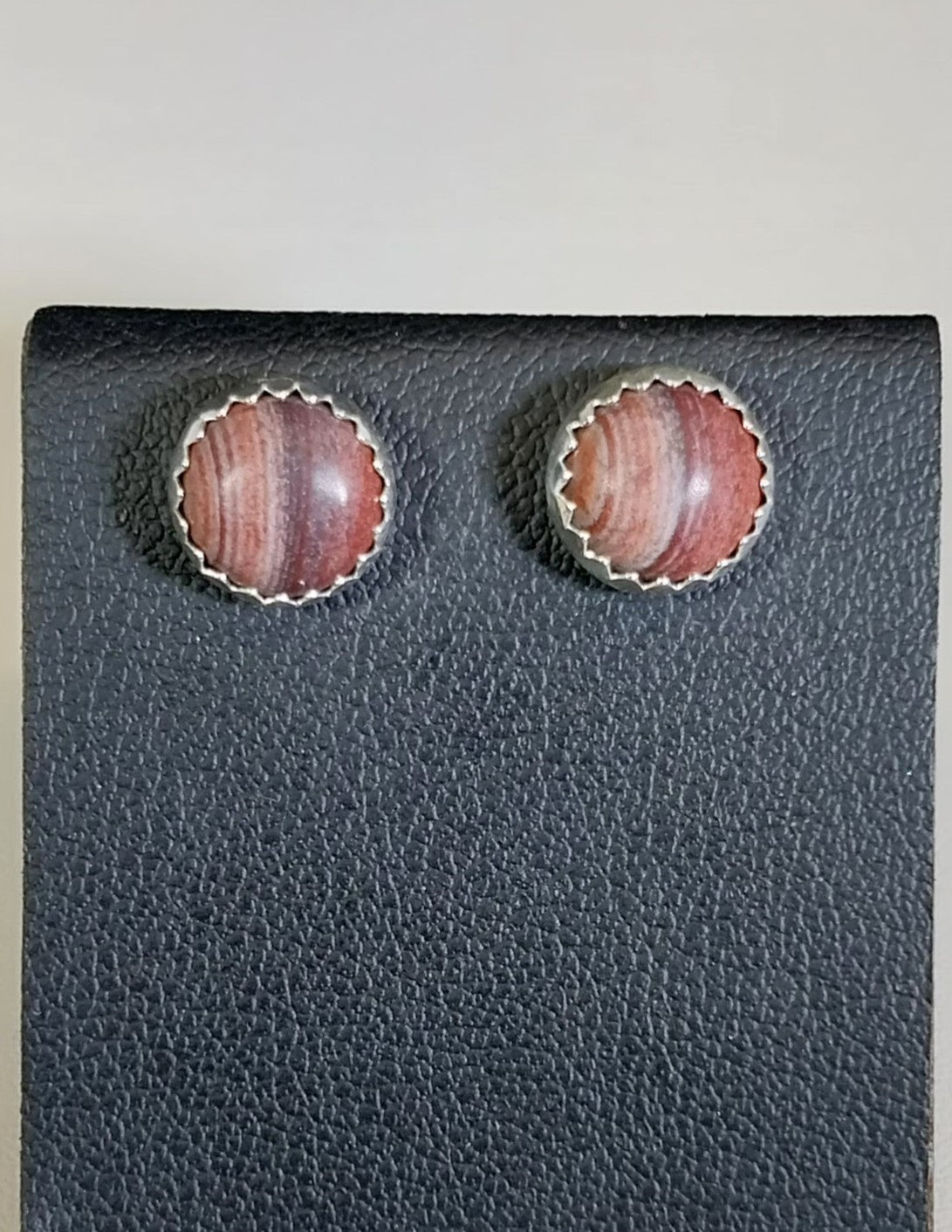 The stones in these earrings are picture jasper from New Mexico. The patterns in these are agate like and the color is very unique. This picture jasper is a soft stone that polishes to a light satin rather than the glossy look you get from agate. I crafted the settings using solid sterling and fine silver (.925 and .999). They are about 9 mm across. The posts are about 10 mm long.