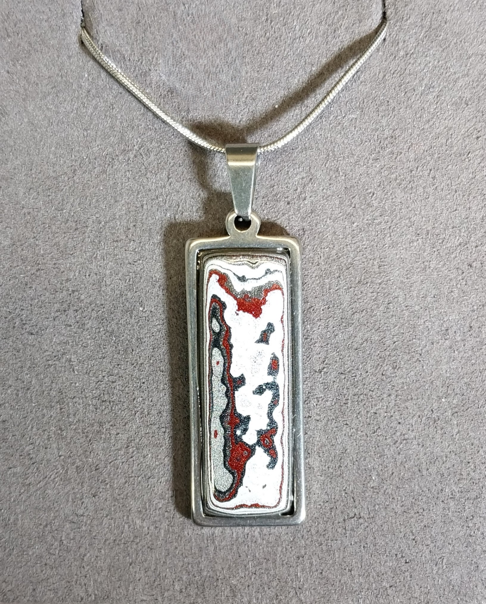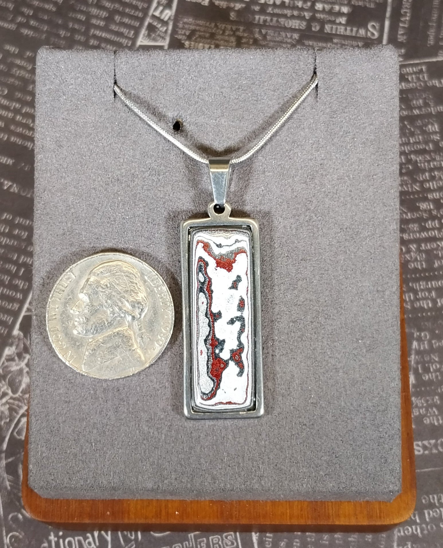 This fordite necklace is a mix of red, white, blue and silver colors. The setting and included chain are stainless steel making it worry free jewelry. The pendant measures about 1.3 x .5 in inches. This fordite originated in Mississippi at the Canton assembly plant.