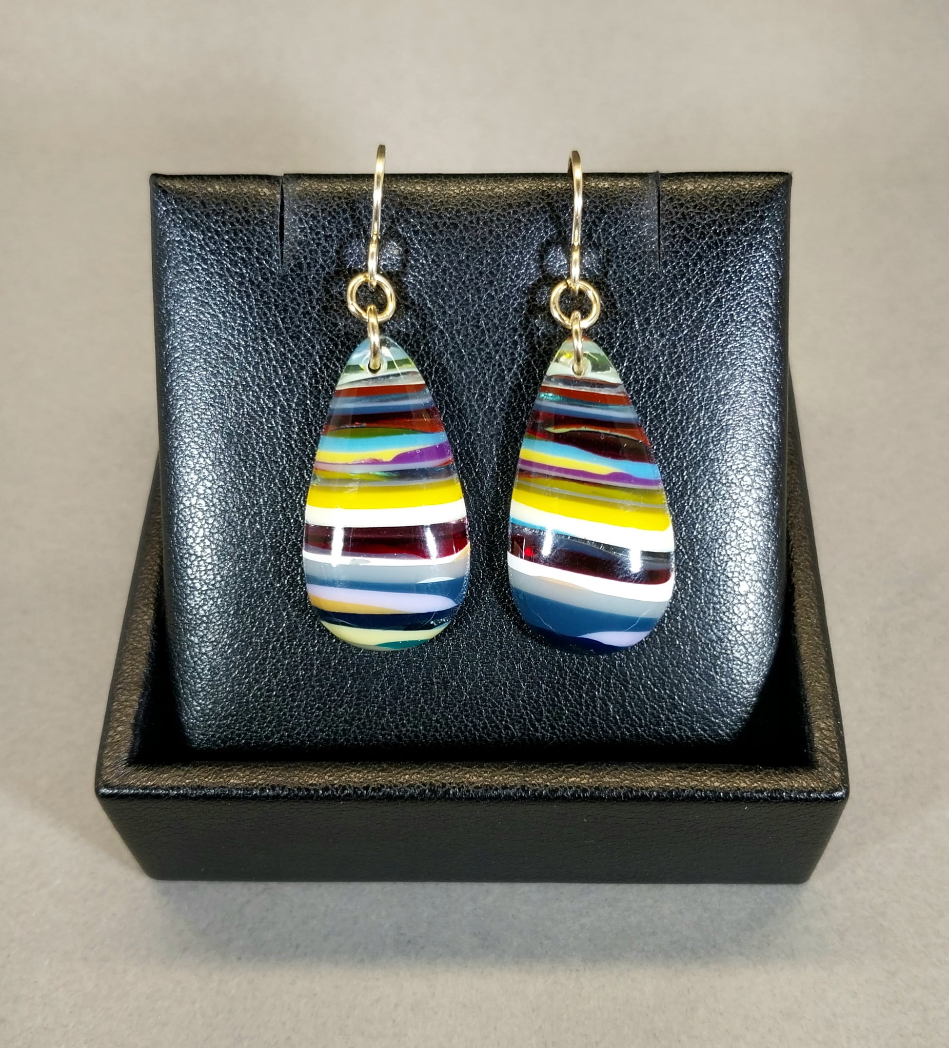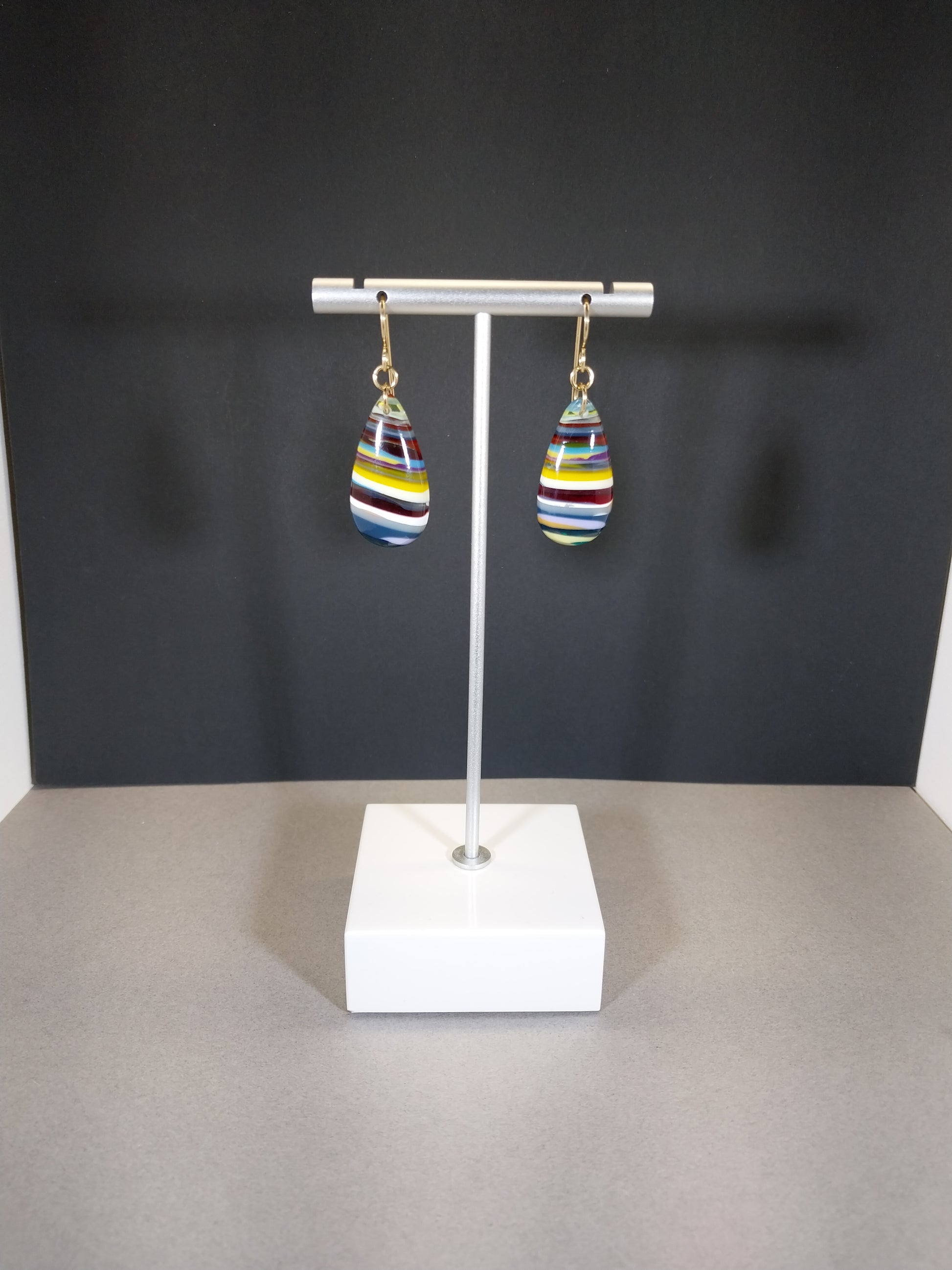 I made this beautiful set of earrings from surfite which is surf board resin that builds up in the manufacturing process as surf boards are spray coated. The buildup is eventually removed and either thrown out or up-cycled into jewelry. Surfite is often brighter appearing in color than fordite (it's automotive cousin) and looks markedly different due to the resin being transparent as well as clear in areas allowing light to pass through. This set of surfite earrings is paired with yellow gold filled ear wires. These are shaped in larger domed teardrops with flat backs. The stone's measure about 29 x 15 in mm. This surfite is from a manufacturer in California.