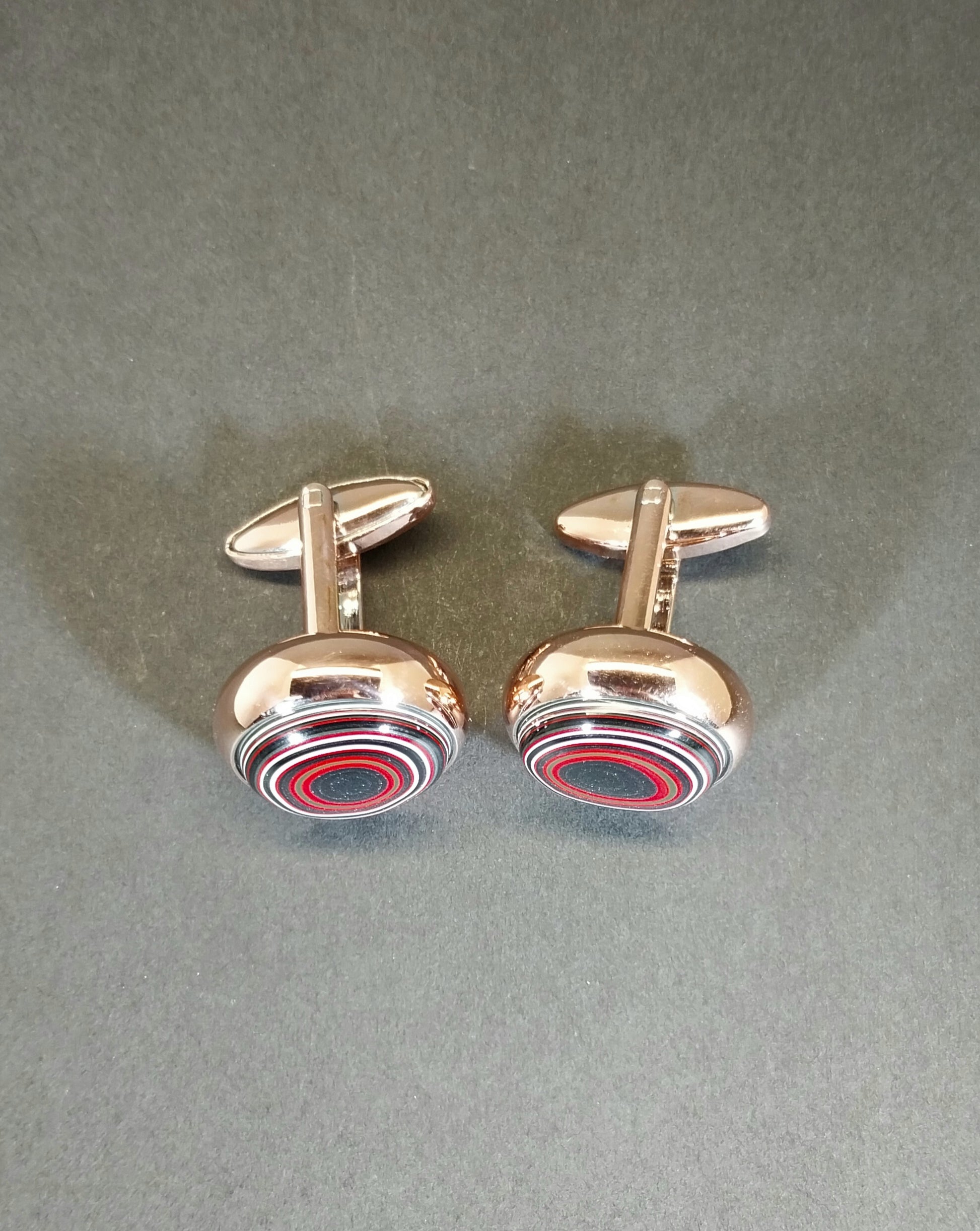 These fordite cuff links are made with fordite from the plant at Parkway in Toledo Ohio i.e. wranglerite fordite. The settings are solid copper. The stones in these are about 16 mm across and have some nice red in them. Copper naturally oxidizes ie tarnishes when left open to air. When not worn these should be kept in the sealed poly bags. If they do tarnish you can polish them with any silver cleaning cloth. These arrive in a jewelry box suitable for gifting and are covered by our lifetime warranty.