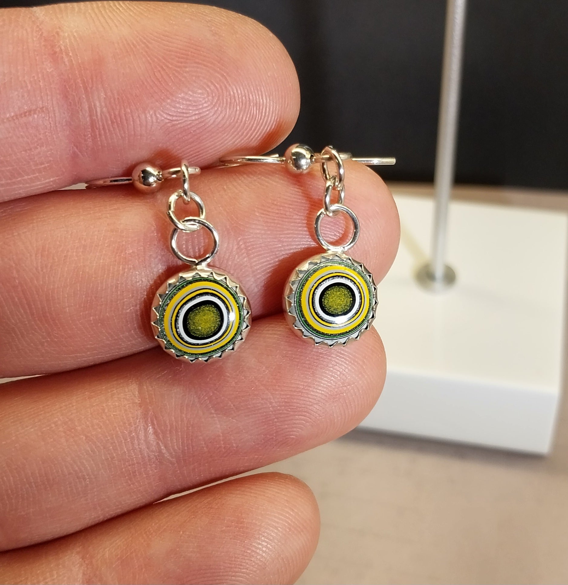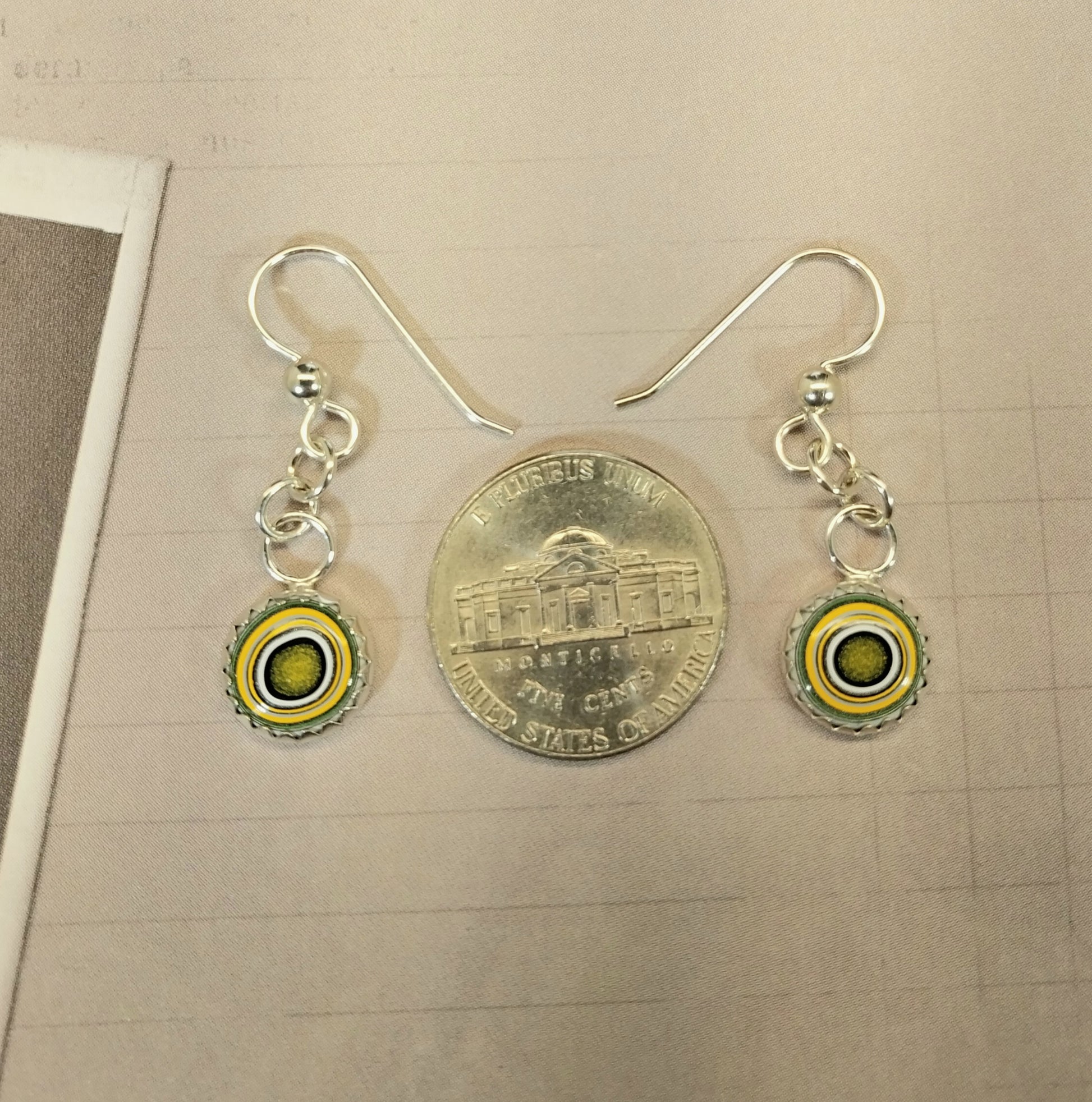 This is a beautiful set of yellow and green fordite earrings in domed rounds. Yellow is one of the more rare colors you can find in fordite. I set these stones in solid sterling silver and paired them with solid argentium sterling silver ear wires which are tarnish resistant and easy to clean. The stones are about 10 mm across. In the settings they measure about 10.6 mm across. This fordite is from the plant at hwy 69 in Claycomo Missouri and occurred while painting the transit line of vehicles (rv type).
